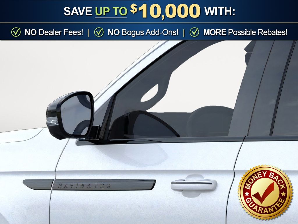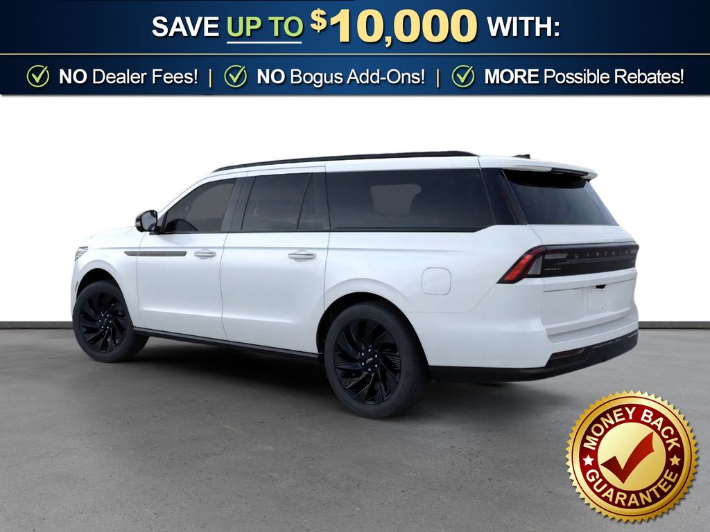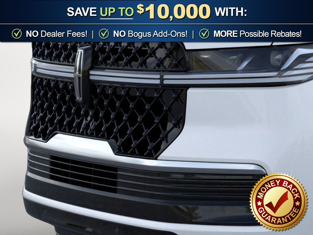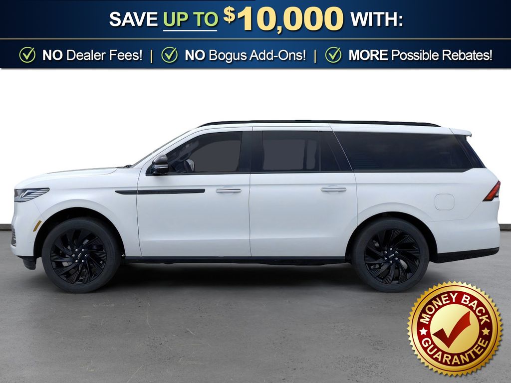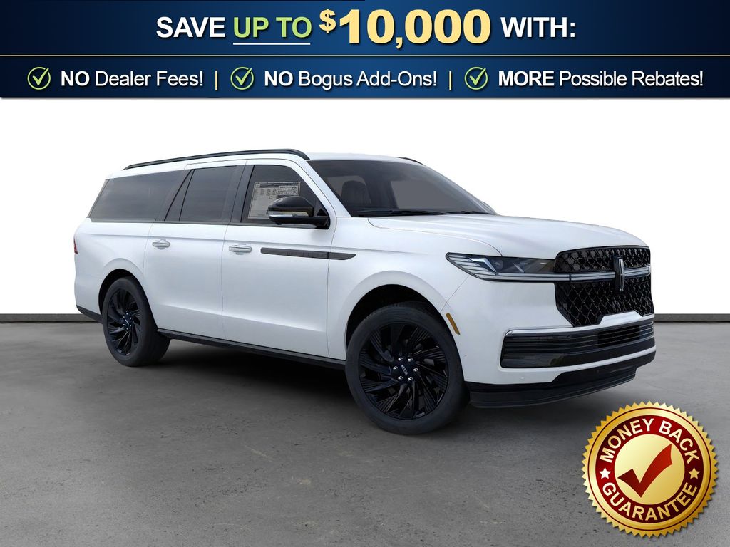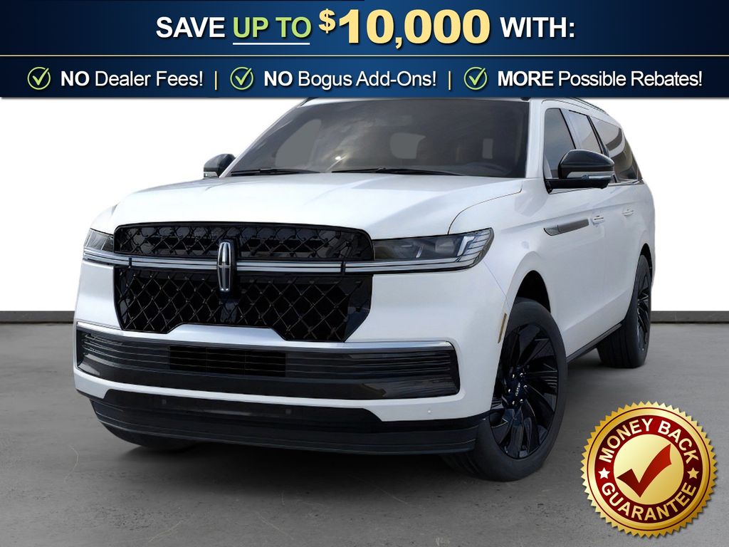 Pristine White Metallic Tri-Coat 2025 Lincoln Navigator L Reserve NLT 4WD 10-Speed Automatic 3.5L V6 26mm Engine Radiator, 28 Speakers, 3rd row seats: split-bench, 4-Wheel Disc Brakes, ABS brakes, Adaptive suspension, Adjustable pedals, Air Conditioning, Alloy wheels, AM/FM radio: SiriusXM with 360L, Apple CarPlay/Android Auto, Audio memory, Auto High-beam Headlights, Auto Htd & Ventilated Premium Lthr Captain's Chair, Auto Start-Stop Technology, Auto tilt-away steering wheel, Auto-dimming door mirrors, Auto-dimming Rear-View mirror, Auto-leveling suspension, Automatic temperature control, Black Accent Badge, Black Accent Interior Pack, Black Beltline Molding, Black Painted Roof Rails, Brake assist, Bumpers: body-color, Compass, Delay-off headlights, Driver door bin, Driver vanity mirror, Driver's Seat Mounted Armrest, Dual front impact airbags, Dual front side impact airbags, Electronic Stability Control, Emergency communication system: 911 Assist, Equipment Group 202A Reserve II, Exterior Parking Camera Rear, Four wheel independent suspension, Front anti-roll bar, Front Bucket Seats, Front Bumper Fascia, Front dual zone A/C, Front reading lights, Fully automatic headlights, Garage door transmitter, Heated door mirrors, Heated front seats, Heated rear seats, Heated steering wheel, Heavy-Duty Trailer Tow Package, HVAC memory, Illuminated entry, Jet Appearance Package, Leather steering wheel, Lincoln Connect, Lincoln Lit Star, Lincoln Premium Connectivity, Low tire pressure warning, Memory seat, Navigation system: Connected Navigation (1-year trial), Occupant sensing airbag, Outside temperature display, Overhead airbag, Overhead console, Panic alarm, Passenger door bin, Passenger seat mounted armrest, Passenger vanity mirror, Pedal memory, Power adjustable front head restraints, Power adjustable rear head restraints, Power door mirrors, Power driver seat, Power moonroof, Power passenger seat, Power steering, Power windows, Radio data system, Radio: Revel Ultima 3D AM/FM/HD Audio System, Rain sensing wipers, Rear air conditioning, Rear anti-roll bar, Rear audio controls, Rear reading lights, Rear window defroster, Rear window wiper, Reclining 3rd row seat, Remote keyless entry, Security system, SiriusXM w/360L, Speed control, Speed-sensing steering, Speed-Sensitive Wipers, Split folding rear seat, Spoiler, Steering wheel memory, Steering wheel mounted audio controls, Tachometer, Telescoping steering wheel, Tilt steering wheel, Traction control, Trailer Brake Controller, Trip computer, Turn signal indicator mirrors, Unique Lincoln Grille Pillar Black Surround, Variably intermittent wipers, Ventilated front seats, Wheels: 22" Dark Tarnished Aluminum, Wheels: 22" High-Gloss Ebony Aluminum.
