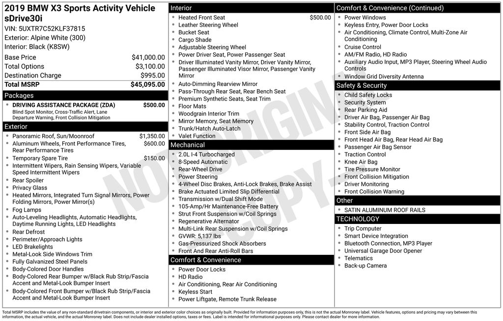 The X3 is fun to drive and the 4-cylinder engine coupled with the 8-speed automatic is spunky. All wheel drive system worked very well while driving in recent snowstorm. Averaging 26 MPG combined. No spare tire as standard tires are run-flat. This worked out recently when a bolt went through one tire and I was able to limp home about 15 miles without changing tire. Interior is not plush by any means but obviously put together with care. Standard stereo is OK. Car has heated seats and full sunroof. The "gotcha" is that even when bought used, BMW supplied the "Connected Drive Package" for free for one year. The list I was given: Spotify, Incremental map update - OTA, Real Time Traffic, BMW Online- News and Weather APP, Traffic Camera Information, Alexa in-Car Speech, Stolen Vehicle Recovery, most of which is taken care of via Apple play or Android Auto. What they do not disclose is that the automatic seat and steering wheel pre-heat function is also part of this package, which makes no sense. My BMW dealer has informed me of a number of customers caught by surprise. - 5.0