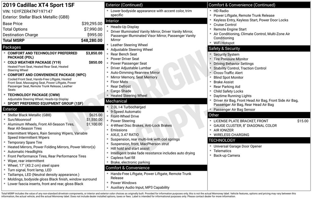 2019 Cadillac XT4 Sport Stellar Black Metallic Sport FWD 9-Speed Automatic 2.0L I4 Turbocharged 20" Twin 5-Spoke Alloy Wheels, 3.47 Axle Ratio, 4-Way Driver Seat Power Lumbar Control, 4-Way Passenger Seat Power Lumbar Control, 4-Wheel Disc Brakes, 4.2" Diagonal Color Display Driver Info Center, 6-Way Power Passenger Seat Adjuster, 7 Speakers, 7-Speaker Audio System w/Auxiliary Amplifier, 8-Way Power Driver Seat Adjuster, 8-Way Power Passenger Seat Adjuster, 8" Diagonal Color Display Driver Info Center, ABS brakes, Air Conditioning, Air Ionizer, Alloy wheels, AM/FM radio: SiriusXM, Apple CarPlay/Android Auto, Auto-dimming door mirrors, Auto-Dimming Inside Rear-View Mirror, Auto-dimming Rear-View mirror, Automatic temperature control, Body-Color Heated Power-Adjustable Outside Mirrors, Brake assist, Bumpers: body-color, Cold Weather Package, Comfort & Convenience Package, Comfort & Technology Preferred Package, Compass, Delay-off headlights, Driver door bin, Driver Seat Massage Control, Driver vanity mirror, Dual front impact airbags, Dual front side impact airbags, Dual Panel Glass Sunroof w/Power Tilt/Sliding, Electronic Cruise Control w/Set & Resume Speed, Electronic Stability Control, Emergency communication system: OnStar and Cadillac connected services capable, Exterior Parking Camera Rear, Four wheel independent suspension, Front & Rear Park Assist, Front anti-roll bar, Front Bucket Seats, Front Center Armrest, Front dual zone A/C, Front License Plate Bracket, Front Passenger Seat Massage Control, Front reading lights, Fully automatic headlights, Garage door transmitter, Hands-Free Liftgate, HD Rear Vision Camera, Heated Automatic Steering Wheel, Heated door mirrors, Heated Driver & Front Passenger Seats, Heated Rear Outboard Seating Positions, Illuminated entry, Knee airbag, Leather Shift Knob, Leather steering wheel, Leatherette Seating Surfaces, Low tire pressure warning, Manual Rake & Telescopic Steering Column, Memory seat, Occupant sensing airbag, Outside temperature display, Overhead airbag, Overhead console, Panic alarm, Passenger door bin, Passenger vanity mirror, Power door mirrors, Power driver seat, Power Liftgate, Power passenger seat, Power Rake & Telescopic Steering Column, Power Rear Liftgate, Power steering, Power windows, Preferred Equipment Group 1SF, Radio data system, Radio: Cadillac User Experience AM/FM Stereo, Rain sensing wipers, Rear anti-roll bar, Rear reading lights, Rear seat center armrest, Rear window defroster, Rear window wiper, Reconfigurable Full-Color Head-Up Display, Remote keyless entry, Roof rack: rails only, Security system, SiriusXM Radio, Speed control, Speed-sensing steering, Split folding rear seat, Spoiler, Sport steering wheel, Standard Suspension, Steering wheel mounted audio controls, Tachometer, Technology Package, Telescoping steering wheel, Tilt steering wheel, Traction control, Trip computer, Variably intermittent wipers, Ventilated Driver & Front Passenger Seats, Voltmeter, Wheels: 18" 10-Spoke Diamond Cut/Argent Met Alloy, Wireless Charging.