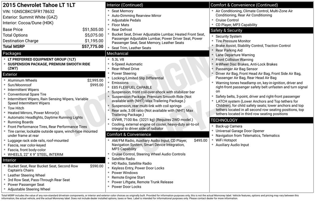 2015 Chevrolet Tahoe LT Summit White LT RWD 6-Speed Automatic Electronic with Overdrive EcoTec3 5.3L V8 Cocoa/Dune Leather, 18" x 8.5" Aluminum Wheels, 22" x 9.0" Steel Interim (LPO) Wheels, 2nd Row 60/40 Split-Folding Manual Bench, 2nd Row Manual Bucket Seats, 3.08 Rear Axle Ratio, 3rd Row Manual 60/40 Split-Folding Fold Flat Bench, 3rd row seats: split-bench, 4-Wheel Disc Brakes, 5 12-Volt Auxiliary Power Outlets, 9 Speakers, ABS brakes, Adjustable pedals, Air Conditioning, Alloy wheels, AM/FM radio: SiriusXM, Auto-Dimming Inside Rear-View Mirror, Auto-dimming Rear-View mirror, Automatic temperature control, Bluetooth® For Phone, Bose Premium 9-Speaker System, Brake assist, Bumpers: body-color, CD player, Compass, Delay-off headlights, Driver door bin, Driver Inboard & Front Passenger Airbags, Driver vanity mirror, Dual front impact airbags, Dual front side impact airbags, Electronic Stability Control, Emergency communication system: OnStar Directions & Connections, Extended-Range Remote Keyless Entry, Exterior Parking Camera Rear, Floor Console, Forward Collision Alert, Front anti-roll bar, Front Bucket Seats, Front Center Armrest, Front dual zone A/C, Front Heated Reclining Bucket Seats, Front reading lights, Front wheel independent suspension, Fully automatic headlights, Garage door transmitter, Heated door mirrors, Heated front seats, Heavy-Duty Rear Locking Differential, Illuminated entry, Lane Departure Warning & Safety Alert Seat, Leather-Appointed Seat Trim, Low tire pressure warning, Memory seat, Memory Settings, Occupant sensing airbag, Outside temperature display, Overhead airbag, Overhead console, Panic alarm, Passenger door bin, Passenger vanity mirror, Pedal memory, Power Adjustable Pedals, Power door mirrors, Power driver seat, Power Liftgate, Power passenger seat, Power steering, Power Sunroof, Power windows, Preferred Equipment Group 1LT, Premium audio system: Chevrolet MyLink, Premium Smooth Ride Suspension Package, Radio: Chevrolet MyLink AM/FM Stereo w/CD Player, Radio: Chevrolet MyLink w/Navigation/AM/FM Stereo, Rain sensing wipers, Rear air conditioning, Rear anti-roll bar, Rear Park Assist w/Audible Warning, Rear reading lights, Rear seat center armrest, Rear window defroster, Rear window wiper, Remote keyless entry, Roof rack: rails only, Security system, Single-Slot CD/MP3 Player, SiriusXM Satellite Radio, Speed control, Speed-sensing steering, Split folding rear seat, Spoiler, Steering wheel mounted audio controls, Tachometer, Telescoping steering wheel, Tilt steering wheel, Traction control, Trip computer, Universal Home Remote, Variably intermittent wipers, Voltmeter, Wheels: 22" 6-Spoke Premium Silver (LPO), Cocoa/Dune Leather.