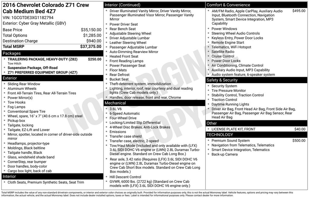 2016 Chevrolet Colorado Z71 Cyber Gray Metallic Z71 4WD 6-Speed Automatic 3.6L V6 DGI DOHC VVT 4WD, 3.42 Rear Axle Ratio, 4-Way Power Front Passenger Seat Adjuster, 4-Wheel Disc Brakes, 6 Speakers, 6-Speaker Audio System Feature, ABS brakes, Air Conditioning, Alloy wheels, AM/FM radio: SiriusXM, Apple CarPlay, Auto-dimming Rear-View mirror, Automatic temperature control, Bose Premium 7-Speaker Audio System Feature, Bumpers: body-color, Cloth/Leatherette Seat Trim, Compass, Delay-off headlights, Driver 4-Way Power Seat Adjuster, Driver door bin, Driver vanity mirror, Dual front impact airbags, Dual front side impact airbags, Electronic Stability Control, Emergency communication system: OnStar Guidance, Exterior Parking Camera Rear, Front anti-roll bar, Front Bucket Seats, Front Center Armrest, Front fog lights, Front License Plate Kit, Front reading lights, Front wheel independent suspension, Fully automatic headlights, Heated Driver & Front Passenger Seats, Heated front seats, Heavy-Duty Trailering Package, Illuminated entry, Low tire pressure warning, Occupant sensing airbag, Outside temperature display, Overhead airbag, Overhead console, Panic alarm, Passenger door bin, Passenger vanity mirror, Power door mirrors, Power Driver Lumbar Control Seat Adjuster, Power driver seat, Power Passenger Lumbar Control Seat Adjuster, Power passenger seat, Power steering, Power windows, Preferred Equipment Group 4Z7, Premium audio system: Chevrolet MyLink, Radio data system, Radio: AM/FM/SiriusXM w/Chevrolet MyLink, Radio: AM/FM/SiriusXM w/Chevrolet MyLink & Nav, Rear reading lights, Rear seat center armrest, Rear step bumper, Rear window defroster, Remote keyless entry, Security system, SiriusXM Satellite Radio, Speed control, Speed-sensing steering, Steering wheel mounted audio controls, Tachometer, Telescoping steering wheel, Tilt steering wheel, Traction control, Trip computer, Variably intermittent wipers, Wheels: 17" x 8" Dark Argent Metallic Cast Alloy, 4WD.