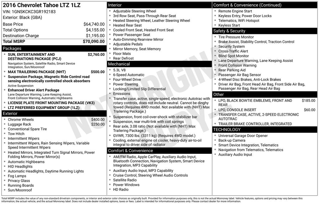 2016 Chevrolet Tahoe LTZ Black LTZ 4WD 6-Speed Automatic Electronic with Overdrive EcoTec3 5.3L V8 4WD, Jet Black Leather, 10 Speakers, 1st & 2nd Row Color-Keyed Carpeted Floor Mats, 2-Speed Active Electronic AutoTrac Transfer Case, 3rd Row 60/40 Power Fold Split-Bench, 3rd row seats: split-bench, 4-Wheel Antilock Disc Brakes, 4-Wheel Disc Brakes, 5 12-Volt Auxiliary Power Outlets, 6-Way Power Front Passenger Seat Adjuster, ABS brakes, Adaptive suspension, Adjustable pedals, Air Conditioning, Alloy wheels, AM/FM radio: SiriusXM, Apple CarPlay, Auto High-beam Headlights, Auto-dimming door mirrors, Auto-Dimming Inside Rear-View Mirror, Auto-dimming Rear-View mirror, Automatic temperature control, Black Assist Steps w/Chrome Accent Strip, Black Roof Rack Cross Rails, Bodyside moldings, Bose Centerpoint Premium 10-Speaker Surround Sound, Brake assist, Bumpers: body-color, CD player, Color-Keyed Carpeting Floor Covering, Compass, Delay-off headlights, Driver door bin, Driver Inboard & Front Passenger Airbags, Driver vanity mirror, Dual front impact airbags, Dual front side impact airbags, Electronic Cruise Control w/Set & Resume Speed, Electronic Stability Control, Emergency communication system: OnStar, Enhanced Driver Instrument Information Display, Exterior Parking Camera Rear, Floor Console, Fog Lamps, Forward Collision Alert Sensor Indicator, Front & Rear Black Bowtie Emblems (LPO), Front & Rear Parking Assist, Front anti-roll bar, Front Bucket Seats, Front Center Armrest, Front dual zone A/C, Front fog lights, Front Heated Reclining Bucket Seats, Front reading lights, Front wheel independent suspension, Fully automatic headlights, Garage door transmitter, Hands Free Power Liftgate, Hanging Tote Console Insert (LPO), Heated & Cooled Driver & Front Passenger Seats, Heated 2nd Row Seats, Heated door mirrors, Heated front seats, Heated Leather Wrapped Steering Wheel, Heated rear seats, Heated steering wheel, High-Intensity Discharge Headlights, Illuminated entry, Integrated Trailer Brake Controller, IntelliBeam Headlamps, Lane Departure Warning System, Lane Keep Assist, License Plate Front Mounting Package, Low tire pressure warning, Magnetic Ride Control Suspension Package, Max Trailering Package, Memory seat, Memory Settings, Navigation System, Occupant sensing airbag, OnStar Basic Plan For 5 Years, Outside temperature display, Overhead airbag, Overhead console, Panic alarm, Passenger door bin, Passenger vanity mirror, Passive Entry System, Pedal memory, Perforated Leather-Appointed Seat Trim, Power door mirrors, Power driver seat, Power Liftgate, Power passenger seat, Power Release 2nd Row Bucket Seats, Power steering, Power Sunroof, Power Tilt & Telescoping Steering Column, Power windows, Power-Adjustable Accelerator & Brake Pedals, Power-Folding Heated Outside Mirrors, Preferred Equipment Group 1LZ, Premium audio system: Chevrolet MyLink, Push Button Keyless Start, Radio: Chevrolet MyLink w/Navigation/AM/FM Stereo, Rain sensing wipers, Rear air conditioning, Rear anti-roll bar, Rear Cross-Traffic Alert, Rear reading lights, Rear Seat Blu-Ray/DVD Entertainment System, Rear window defroster, Rear window wiper, Remote Keyless Entry, Remote keyless entry, Roof rack: rails only, Roof-Mounted Luggage Rack Side Rails, Safety Alert Driver Seat, Security system, Side Blind Zone Alert w/Lane Change Alert, Single-Slot CD/MP3 Player, SiriusXM Satellite Radio, Speed control, Speed-sensing steering, Split folding rear seat, Spoiler, Steering wheel memory, Steering wheel mounted audio controls, Sun, Entertainment & Destinations Package, Tachometer, Telescoping steering wheel, Tilt steering wheel, Traction control, Trip computer, Turn signal indicator mirrors, Unauthorized Entry Electrical Theft Deterrent Sys., Universal Home Remote, Variably intermittent wipers, Ventilated front seats, Voltmeter, Wheels: 20" x 9" Chrome, Wheels: 20" x 9" Polished-Aluminum, Wireless Charging, 4WD, Jet Black Leather.