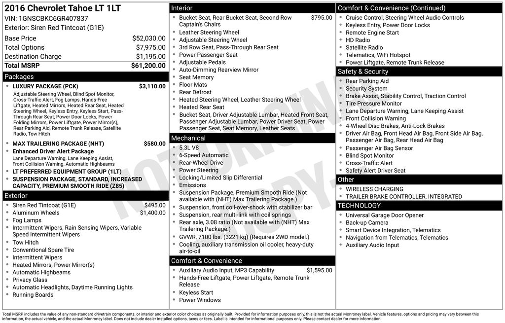 2016 Chevrolet Tahoe LT Siren Red Tintcoat LT RWD 6-Speed Automatic Electronic with Overdrive EcoTec3 5.3L V8 Jet Black Leather, 18" x 8.5" Aluminum Wheels, 1st & 2nd Row Color-Keyed Carpeted Floor Mats, 2nd Row 60/40 Split-Folding Manual Bench, 2nd Row Pwr Release 60/40 Split Folding Bench Seat, 3rd Row 60/40 Power Fold Split-Bench, 3rd Row Manual 60/40 Split-Folding Fold Flat Bench, 3rd row seats: split-bench, 4-Wheel Antilock Disc Brakes, 4-Wheel Disc Brakes, 5 12-Volt Auxiliary Power Outlets, 6-Way Power Front Passenger Seat Adjuster, 9 Speakers, ABS brakes, Adjustable pedals, Air Conditioning, Alloy wheels, AM/FM radio: SiriusXM, Apple CarPlay, Auto High-beam Headlights, Auto-Dimming Inside Rear-View Mirror, Auto-dimming Rear-View mirror, Automatic temperature control, Black Assist Steps, Bose Premium 9-Speaker System, Brake assist, Bumpers: body-color, CD player, Color-Keyed Carpeting Floor Covering, Compass, Delay-off headlights, Driver door bin, Driver Inboard & Front Passenger Airbags, Driver vanity mirror, Dual front impact airbags, Dual front side impact airbags, Electronic Cruise Control w/Set & Resume Speed, Electronic Stability Control, Emergency communication system: OnStar, Enhanced Driver Instrument Information Display, Extended-Range Remote Keyless Entry, Exterior Parking Camera Rear, Floor Console, Fog Lamps, Forward Collision Alert Sensor Indicator, Front & Rear Parking Assist, Front anti-roll bar, Front Bucket Seats, Front Center Armrest, Front dual zone A/C, Front Heated Reclining Bucket Seats, Front reading lights, Front wheel independent suspension, Fully automatic headlights, Garage door transmitter, Hands Free Power Liftgate, Heated 2nd Row Seats, Heated door mirrors, Heated front seats, Heated Leather Wrapped Steering Wheel, Illuminated entry, Integrated Trailer Brake Controller, IntelliBeam Headlamps, Lane Departure Warning System, Lane Keep Assist, Leather-Appointed Seat Trim, Leather-Wrapped Steering Wheel, Low tire pressure warning, Luxury Package, Max Trailering Package, Memory seat, Memory Settings, Occupant sensing airbag, OnStar Basic Plan For 5 Years, Outside temperature display, Overhead airbag, Overhead console, Panic alarm, Passenger door bin, Passenger vanity mirror, Passive Entry System, Pedal memory, Power door mirrors, Power driver seat, Power Liftgate, Power passenger seat, Power Release 2nd Row Bucket Seats, Power steering, Power Tilt & Telescopic Steering Column w/Memory, Power windows, Power-Adjustable Accelerator & Brake Pedals, Power-Folding Heated Outside Mirrors, Preferred Equipment Group 1LT, Premium audio system: Chevrolet MyLink, Premium Smooth Ride Suspension Package, Push Button Keyless Start, Radio: Chevrolet MyLink AM/FM Stereo, Rain sensing wipers, Rear air conditioning, Rear anti-roll bar, Rear Cross-Traffic Alert, Rear Park Assist w/Audible Warning, Rear reading lights, Rear Seat Blu-Ray/DVD Entertainment System, Rear seat center armrest, Rear window defroster, Rear window wiper, Remote keyless entry, Roof rack: rails only, Roof-Mounted Luggage Rack Side Rails, Safety Alert Driver Seat, Security system, Side Blind Zone Alert w/Lane Change Alert, Single-Slot CD/MP3 Player, SiriusXM Satellite Radio, Speed control, Speed-sensing steering, Split folding rear seat, Spoiler, Standard Suspension Package, Steering wheel mounted audio controls, Tachometer, Telescoping steering wheel, Tilt steering wheel, Traction control, Trip computer, Unauthorized Entry Electrical Theft Deterrent Sys., Universal Home Remote, Variably intermittent wipers, Voltmeter, Wheels: 20" x 9" Polished-Aluminum, Wireless Charging, Jet Black Leather.