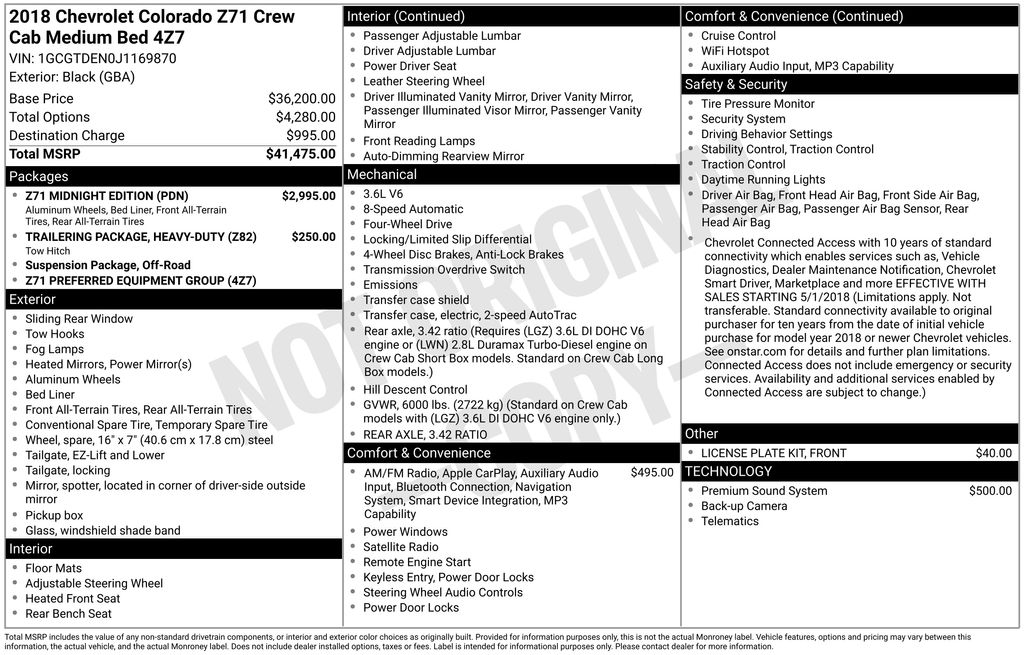 2018 Chevrolet Colorado Z71 Black Z71 4WD 8-Speed Automatic V6 4WD, 3.42 Rear Axle Ratio, 4-Way Power Front Passenger Seat Adjuster, 4-Wheel Disc Brakes, 6 Speakers, 6-Speaker Audio System Feature, ABS brakes, Air Conditioning, All-Weather Floor Liner (LPO), Alloy wheels, AM/FM radio: SiriusXM, Apple CarPlay, Auto-dimming Rear-View mirror, Automatic temperature control, Black Spray-On Bedliner w/Chevrolet Logo, Bose Premium 7-Speaker Audio System Feature, Bumpers: body-color, Cloth/Leatherette Seat Trim, Compass, Delay-off headlights, Driver 4-Way Power Seat Adjuster, Driver door bin, Driver vanity mirror, Dual front impact airbags, Dual front side impact airbags, Electronic Stability Control, Exterior Parking Camera Rear, Front anti-roll bar, Front Bucket Seats, Front Center Armrest, Front fog lights, Front License Plate Kit, Front reading lights, Front wheel independent suspension, Fully automatic headlights, Heated door mirrors, Heated Driver & Front Passenger Seats, Heated front seats, Heavy-Duty Trailering Package, Illuminated entry, Low tire pressure warning, Occupant sensing airbag, Outside temperature display, Overhead airbag, Overhead console, Panic alarm, Passenger door bin, Passenger vanity mirror, Power door mirrors, Power Driver Lumbar Control Seat Adjuster, Power driver seat, Power Passenger Lumbar Control Seat Adjuster, Power passenger seat, Power steering, Power windows, Preferred Equipment Group 4Z7, Premium audio system: Chevrolet MyLink, Radio data system, Radio: AM/FM Stereo w/8" Diagonal Color Touch Nav., Radio: AM/FM Stereo w/8" Diagonal Color Touch Screen, Rear reading lights, Rear seat center armrest, Rear step bumper, Rear window defroster, Remote keyless entry, Security system, SiriusXM Satellite Radio, Speed control, Speed-sensing steering, Steering wheel mounted audio controls, Tachometer, Telescoping steering wheel, Tilt steering wheel, Tow/Haul Mode, Traction control, Trip computer, Variably intermittent wipers, Wheels: 17" x 8" Dark Argent Metallic Cast Alloy, Wheels: 17" x 8" Gloss Black Aluminum, Z71 Midnight Edition, 4WD.