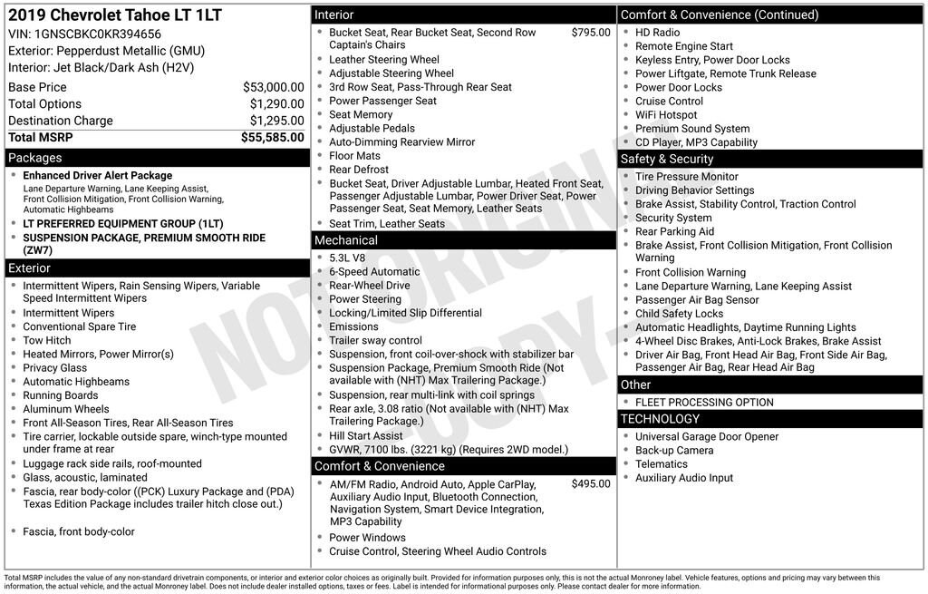 Recent Arrival! Jet Black/Dark Ash Leather, 18 x 8.5 Aluminum Wheels, 1st & 2nd Row Color-Keyed Carpeted Floor Mats, 2nd Row 60/40 Split-Folding Manual Bench, 2nd Row Manual Bucket Seats, 3.08 Rear Axle Ratio, 3rd Row Manual 60/40 Split-Folding Fold Flat Bench, 3rd row seats: split-bench, 4-Wheel Antilock Disc Brakes w/Brake Assist, 4-Wheel Disc Brakes, 5 12-Volt Auxiliary Power Outlets, 9 Speakers, ABS brakes, Adjustable pedals, Air Conditioning, Alloy wheels, AM/FM radio: SiriusXM, Apple CarPlay/Android Auto, Auto High-beam Headlights, Auto-Dimming Inside Rear-View Mirror, Auto-dimming Rear-View mirror, Automatic temperature control, Black Assist Steps, Bluetooth® For Phone, Bose Premium 9-Speaker System, Brake assist, Bumpers: body-color, Cargo Net, CD player, Color-Keyed Carpeting Floor Covering, Compass, Delay-off headlights, Driver door bin, Driver Inboard & Front Passenger Airbags, Driver vanity mirror, Dual front impact airbags, Dual front side impact airbags, Electronic Cruise Control w/Set & Resume Speed, Electronic Stability Control, Emergency communication system: OnStar and Chevrolet connected services capable, Enhanced Driver Alert Package (Y86), Extended-Range Remote Keyless Entry, Exterior Parking Camera Rear, Floor Console, Forward Collision Alert, Front anti-roll bar, Front Bucket Seats, Front Center Armrest, Front dual zone A/C, Front Heated Reclining Bucket Seats, Front Passenger 6-Way Power Seat Adjuster, Front reading lights, Front wheel independent suspension, Fully automatic headlights, Garage door transmitter, HD Radio, Heated door mirrors, Heated front seats, Illuminated entry, IntelliBeam Headlamps, Lane Keep Assist w/Lane Departure Warning, Leather-Appointed Seat Trim, Leather-Wrapped Steering Wheel, Low Speed Forward Automatic Braking, Low tire pressure warning, Memory seat, Memory Settings, Occupant sensing airbag, Outside temperature display, Overhead airbag, Overhead console, Panic alarm, Passenger door bin, Passenger vanity mirror, Pedal memory, Power door mirrors, Power driver seat, Power Liftgate, Power passenger seat, Power steering, Power windows, Power-Adjustable Accelerator & Brake Pedals, Preferred Equipment Group 1LT, Premium audio system: Chevrolet MyLink, Premium Smooth Ride Suspension Package, Radio: Chevrolet Infotainment AM/FM Stereo, Radio: Chevrolet Infotainment AM/FM Stereo w/Nav, Rain sensing wipers, Rear air conditioning, Rear anti-roll bar, Rear Park Assist w/Audible Warning, Rear reading lights, Rear seat center armrest, Rear window defroster, Rear window wiper, Remote keyless entry, Remote Vehicle Start, Roof rack: rails only, Roof-Mounted Luggage Rack Side Rails, Security system, Single-Slot CD/MP3 Player, SiriusXM NavTraffic, SiriusXM Radio, Speed control, Speed-sensing steering, Split folding rear seat, Spoiler, Steering wheel mounted audio controls, Tachometer, Telescoping steering wheel, Tilt steering wheel, Traction control, Trip computer, Universal Home Remote, Variably intermittent wipers, Voltmeter, Jet Black/Dark Ash Leather.2019 Chevrolet Tahoe LT RWD 6-Speed Automatic Electronic with Overdrive EcoTec3 5.3L V8 Pepperdust MetallicOdometer is 11125 miles below market average!Awards:* JD Power Initial Quality Study * 2019 KBB.com Best Resale Value Awards