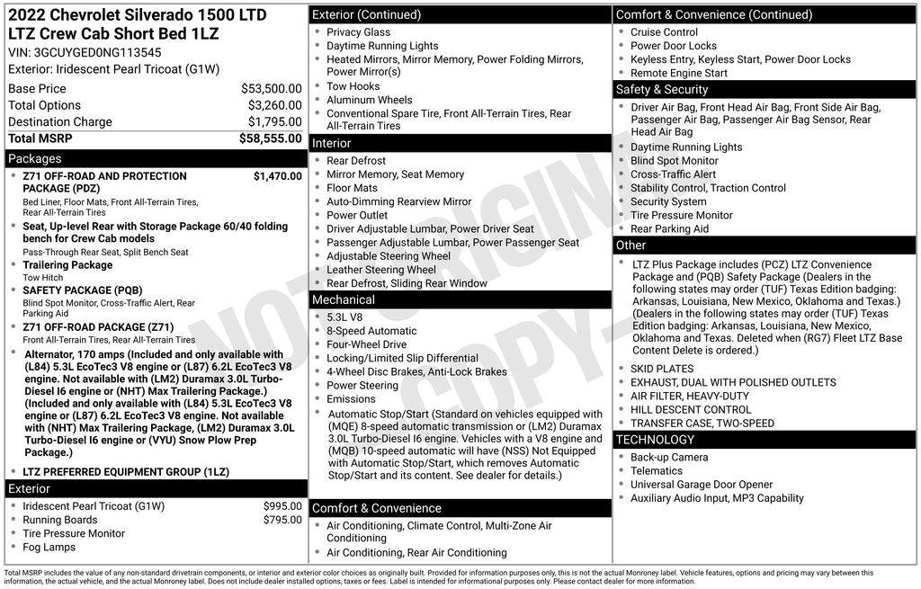 2022 Chevrolet Silverado 1500 LTD LTZ Iridescent Pearl Tricoat LTZ 4WD 8-Speed Automatic EcoTec3 5.3L V8 10-Way Power Driver Seat w/Lumbar, 10-Way Power Passenger Seat Adjuster w/Lumbar, 12-Volt Rear Auxiliary Power Outlet, 120-Volt Bed Mounted Power Outlet, 120-Volt Instrument Panel Power Outlet, 170 Amp Alternator, 2 USB Ports, 2 USB Ports (First Row), 3.23 Rear Axle Ratio, 4-Wheel Disc Brakes, 4.2" Diagonal Color Display Driver Info Center, 4" Chromed Round Assist Steps (LPO), 6 Speakers, 6-Speaker Audio System, ABS brakes, Advanced Trailering System, Air Conditioning, All-Weather Floor Liner (LPO) (AAK), Alloy wheels, AM/FM radio: SiriusXM with 360L, Apple CarPlay/Android Auto, Auto-dimming door mirrors, Auto-Dimming Inside Rear-View Mirror, Auto-dimming Rear-View mirror, Auto-Locking Rear Differential, Automatic temperature control, Auxiliary External Transmission Oil Cooler, Bluetooth® For Phone, Brake assist, Bumpers: chrome, Chevrolet Connected Access Capable, Chevytec Spray-On Black Bedliner, Chrome Grille, Chrome Mirror Caps, Color-Keyed Carpeting Floor Covering, Compass, Deep-Tinted Glass, Delay-off headlights, Driver door bin, Driver Memory, Driver vanity mirror, Dual Exhaust w/Polished Outlets, Dual front impact airbags, Dual front side impact airbags, Electric Rear-Window Defogger, Electronic Cruise Control, Electronic Stability Control, Floor Mounted Center Console, Front anti-roll bar, Front Bucket Seats, Front Center Armrest, Front dual zone A/C, Front fog lights, Front Frame-Mounted Black Recovery Hooks, Front LED Fog Lamps, Front reading lights, Front Rubberized Vinyl Floor Mats, Front wheel independent suspension, Fully automatic headlights, Garage door transmitter, HD Rear Vision Camera, Heated door mirrors, Heated Driver & Front Outboard Passenger Seats, Heated front seats, Heated Steering Wheel, Heated steering wheel, Heavy Duty Suspension, Heavy-Duty Air Filter, Hill Descent Control, Hitch Guidance, Hitch Guidance w/Hitch View, Illuminated entry, Integrated Trailer Brake Controller, Keyless Open & Start, Lane Change Alert w/Side Blind Zone Alert, Leather Wrapped Steering Wheel, LED Cargo Area Lighting, Low tire pressure warning, LTZ Convenience Package, LTZ Plus Package, Manual Tilt/Telescoping Steering Column, Memory seat, Occupant sensing airbag, Off-Road Suspension, OnStar & Chevrolet Connected Services Capable, Outside Heated Power-Adjustable Mirrors, Outside temperature display, Overhead airbag, Overhead console, Panic alarm, Passenger door bin, Passenger vanity mirror, Perforated Leather-Appointed Front Seat Trim, Perimeter Lighting, Power Door Locks, Power door mirrors, Power driver seat, Power Front Passenger Windows w/Express Up/Down, Power Front Windows w/Driver Express Up/Down, Power passenger seat, Power Rear Windows w/Express Down, Power Sliding Rear Window w/Rear Defogger, Power steering, Power Tailgate, Power windows, Preferred Equipment Group 1LZ, Premium audio system: Chevrolet Infotainment 3 Plus, Radio data system, Radio: Chevrolet Infotainment 3 Plus System, Rear Cross Traffic Alert, Rear Dual USB Charging-Only Ports, Rear reading lights, Rear Rubberized-Vinyl Floor Mats, Rear seat center armrest, Rear step bumper, Rear Wheelhouse Liners, Rear window defroster, Remote keyless entry, Remote Vehicle Starter System, Safety Package, Security system, SiriusXM w/360L, Speed control, Speed-sensing steering, Split folding rear seat, Standard Tailgate, Steering Wheel Audio Controls, Steering wheel mounted audio controls, Tachometer, Telescoping steering wheel, Theft Deterrent System (Unauthorized Entry), Tilt steering wheel, Traction control, Trailering Package, Trip computer, Ultrasonic Front & Rear Park Assist, Universal Home Remote, Up-Level Rear Seat w/Storage Package, Variably intermittent wipers, Ventilated Driver & Front Passenger Seats, Ventilated front seats, Voltmeter, Wheels: 20" x 9" Polished Finish, Wi-Fi Hot Spot Capable, Wireless Phone Projection, Z71 Off-Road & Protection Pac