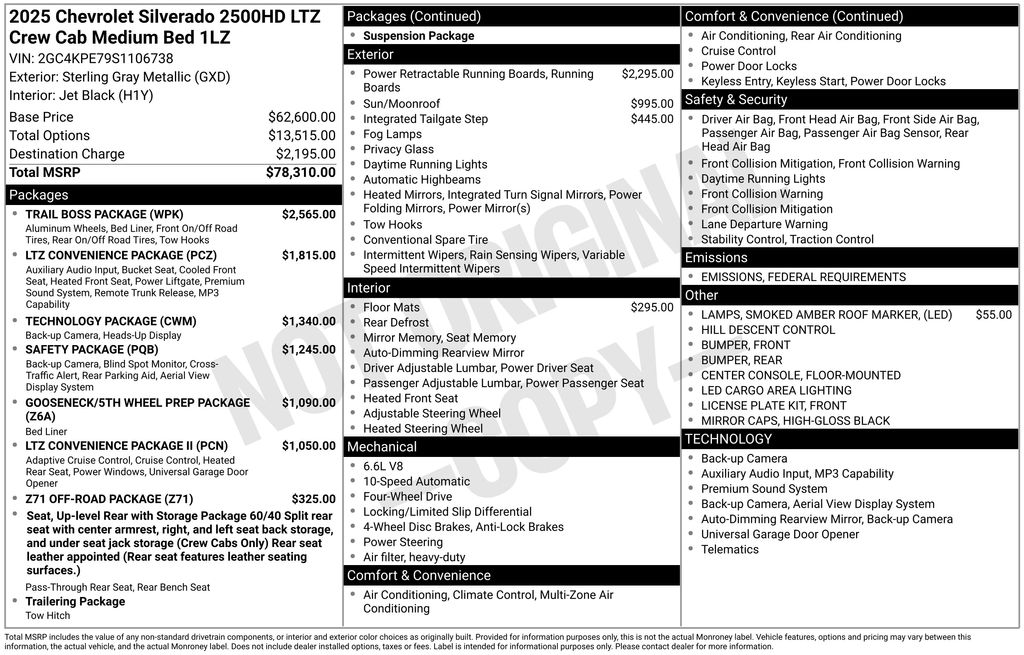 2025 Chevrolet Silverado 2500HD LTZ **Here at Long-Lewis we believe in being transparent. We have no Doc fees, or any other hidden fees. We are a one price store and give our best price up front and they are clearly marked on all our inventory.** Sterling Gray Metallic 4WD 10-Speed Automatic 6.6L V8 10-Speed Automatic, 4WD, Jet Black Leather.