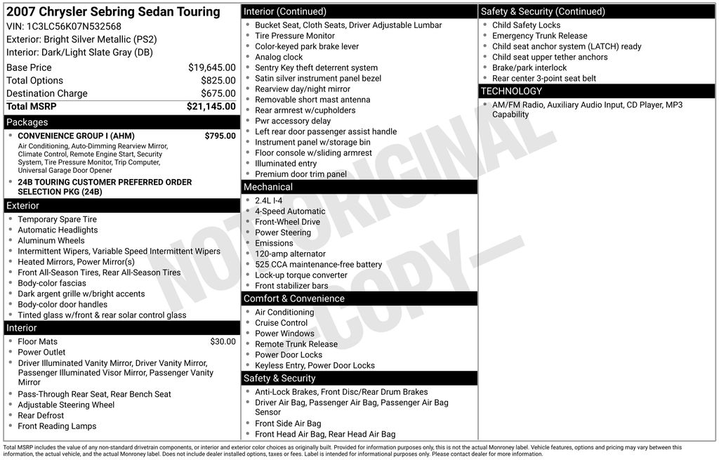 2007 Chrysler Sebring Touring Silver Touring FWD 4-Speed Automatic VLP 2.4L 4-Cylinder DOHC 16V Dual VVT 17 x 6.5 Aluminum Wheels, 6 Speakers, ABS brakes, Air Conditioning, Alloy wheels, AM/FM CD/MP3 Radio, AM/FM radio, Bumpers: body-color, CD player, Delay-off headlights, Driver door bin, Driver vanity mirror, Dual front impact airbags, Dual front side impact airbags, Four wheel independent suspension, Front anti-roll bar, Front Bucket Seats, Front Center Armrest w/Storage, Front reading lights, Fully automatic headlights, Heated door mirrors, Illuminated entry, Low tire pressure warning, Outside temperature display, Overhead airbag, Overhead console, Panic alarm, Passenger door bin, Passenger vanity mirror, Power door mirrors, Power steering, Power windows, Premium Cloth Low-Back Bucket Seats, Radio data system, Rear anti-roll bar, Rear reading lights, Rear seat center armrest, Rear window defroster, Remote keyless entry, Speed control, Speed-sensing steering, Speed-Sensitive Wipers, Split folding rear seat, Sport steering wheel, Tachometer, Telescoping steering wheel, Tilt steering wheel, Variably intermittent wipers, Weather band radio.