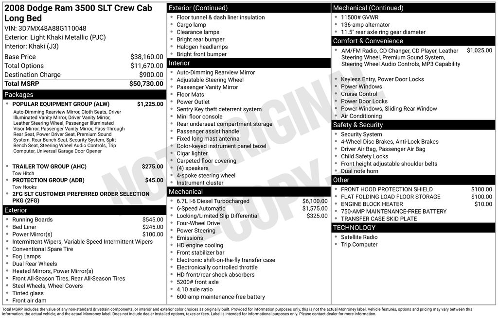2008 Dodge Ram 3500 SLT Light Khaki Metallic Clearcoat SLT 4WD 6-Speed Automatic Cummins 6.7L I6 Turbodiesel Cummins 6.7L I6 Turbodiesel, 4WD, 17" x 6" Steel Wheels, 17" x 8" Forged Aluminum Wheels, 4 Speakers, 4-Wheel Disc Brakes, 40/20/40 Split Bench Seat, 750 Amp Maintenance Free Battery, ABS brakes, Air Conditioning, AM/FM Compact Disc w/SIRIUS Satellite, AM/FM radio: SIRIUS, Anti-Spin Differential Rear Axle, Auto-Dimming Rear-View Mirror, Badge, Bumpers: chrome, CD player, Center Hub, Chrome Tubular Side Steps, Cloth 40/20/40 Split Bench Seat, Compass, Delay-off headlights, Diesel Exhaust Brake, Driver door bin, Dual front impact airbags, Dual rear wheels, Electronically Controlled Throttle, Engine Block Heater, Folding Flat Load Floor Storage, Front Air Close Out Panel, Front anti-roll bar, Front Center Armrest, Front fog lights, Front Hood Protection Shield, Front reading lights, General Brand Tires, Heated door mirrors, Hood Insulation, Illuminated entry, Outside temperature display, Overhead console, Panic alarm, Passenger door bin, Passenger vanity mirror, Popular Equipment Group, Power door mirrors, Power Fold-Away Trailer Tow Mirrors, Power steering, Power windows, Protection Group, Quick Order Package 2FG SLT, Rear 60/40 Split Folding Seat, Rear Folding Seat, Rear step bumper, Remote keyless entry, Security Alarm, SIRIUS Satellite Radio, Speed control, Speed-Sensitive Wipers, Stain Repel Seat Fabric, Tachometer, Tilt steering wheel, Trailer Tow Group, Trip computer, Under Rail Box Bedliner, Variably intermittent wipers, Voltmeter, Cummins 6.7L I6 Turbodiesel, 4WD.