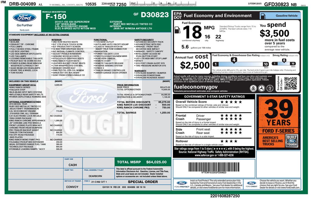 2016 Ford F-150 King Ranch 4WD Crew Cab. Thats a great truck! The King Ranch trim adds a lot of luxury and style to the rugged F-150, with features like premium leather seats, wood interior accents, and advanced technology.The King Ranch also comes with some specific upgrades, like: