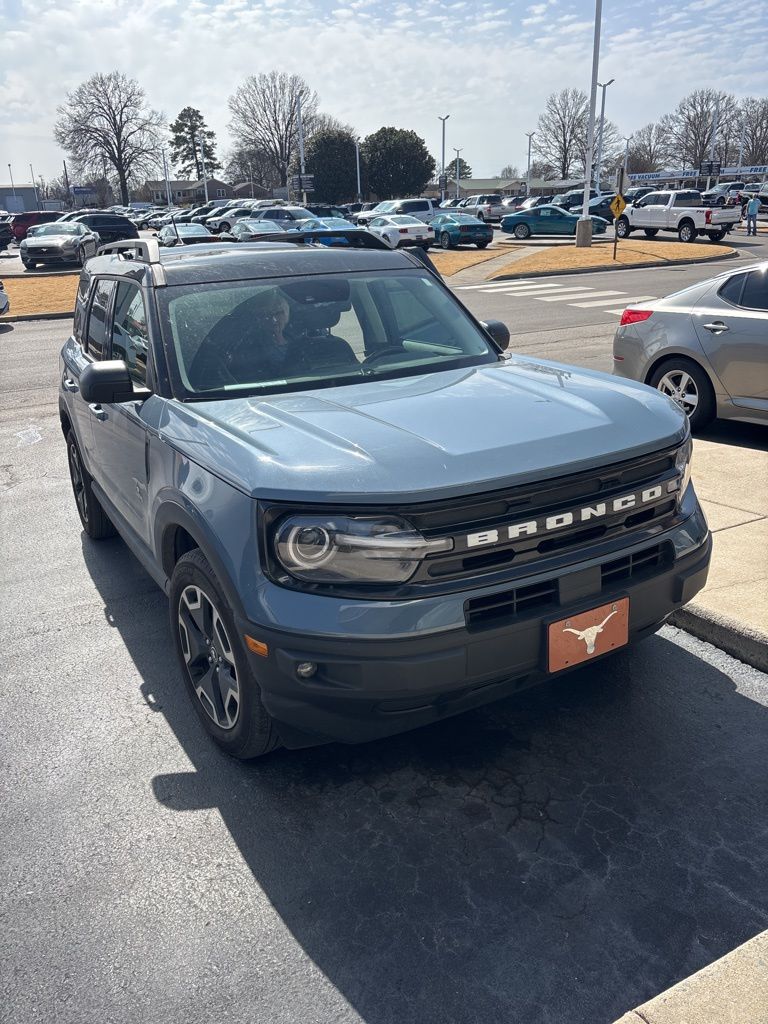 2024 Ford Bronco Sport Outer Banks Azure Gray Metallic Outer Banks 4WD 8-Speed Automatic 1.5L EcoBoost 3.80 Axle Ratio, 4-Wheel Disc Brakes, 6 Speakers, ABS brakes, Air Conditioning, Alloy wheels, AM/FM radio: SiriusXM, AM/FM Stereo, Auto High-beam Headlights, Auto-dimming Rear-View mirror, Automatic temperature control, Brake assist, Cargo Management System, Cargo Mat, Compass, Delay-off headlights, Driver door bin, Driver vanity mirror, Dual front impact airbags, Dual front side impact airbags, Electronic Stability Control, Emergency communication system: SYNC 3 911 Assist, Equipment Group 300A, Evasive Steering Assist, Ford Co-Pilot360 Assist+, Four wheel independent suspension, Front & Rear Floor Liners w/o Carpet Mats, Front anti-roll bar, Front Bucket Seats, Front Center Armrest, Front dual zone A/C, Front fog lights, Front License Plate Bracket, Front reading lights, Fully automatic headlights, HD Radio, Heated door mirrors, Heated front seats, Heated steering wheel, Illuminated entry, Intelligent Adaptive Cruise Control w/Stop & Go, Knee airbag, Low tire pressure warning, Memory seat, Occupant sensing airbag, Outside temperature display, Overhead airbag, Overhead console, Panic alarm, Passenger door bin, Passenger vanity mirror, Power door mirrors, Power driver seat, Power Moonroof, Power passenger seat, Power steering, Power windows, Premium-Trimmed Heated Sport Contour Bucket Seats, Radio data system, Rain sensing wipers, Rear anti-roll bar, Rear Parking Sensors, Rear reading lights, Rear seat center armrest, Rear window defroster, Rear window wiper, Remote keyless entry, Security system, SiriusXM, Speed control, Speed-sensing steering, Speed-Sensitive Wipers, Split folding rear seat, Steering wheel mounted audio controls, SYNC 3 Communications & Entertainment System, Tachometer, Tech Package, Telescoping steering wheel, Tilt steering wheel, Traction control, Trip computer, Universal Garage Door Opener (UGDO), Variably intermittent wipers, Voice-Activated Touchscreen Navigation System, Wheels: 18" Ebony Black-Painted Aluminum, Wireless Charging Pad.