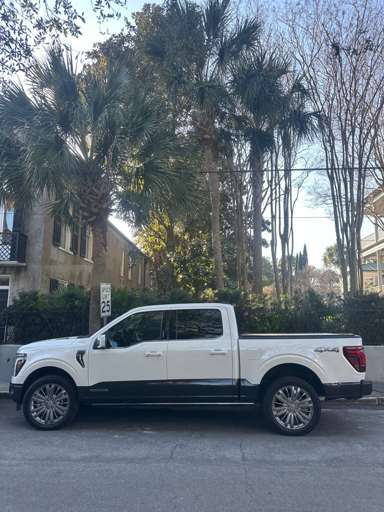 2024 Ford F-150 King Ranch Star White Metallic Tri-Coat King Ranch 4WD 10-Speed Automatic 3.5L PowerBoost Full-Hybrid V6 3.5L PowerBoost Full-Hybrid V6, 4WD, 14 Speakers, 4-Wheel Disc Brakes, ABS brakes, Adaptive suspension, Adjustable pedals, Air Conditioning, Alloy wheels, AM/FM radio: SiriusXM with 360L, Auto High-beam Headlights, Auto-dimming door mirrors, Auto-dimming Rear-View mirror, Automatic temperature control, Brake assist, Chrome wheels, Compass, Delay-off headlights, Driver door bin, Driver vanity mirror, Dual front impact airbags, Dual front side impact airbags, Electronic Stability Control, Emergency communication system: SYNC 4 911 Assist, Engine Block Heater, Equipment Group 601A High, Front anti-roll bar, Front Bucket Seats, Front Center Armrest, Front dual zone A/C, Front fog lights, Front reading lights, Front wheel independent suspension, Fully automatic headlights, Garage door transmitter, Genuine wood dashboard insert, Heads-Up Display, Heated door mirrors, Heated front seats, Heated rear seats, Heated steering wheel, Illuminated entry, King Ranch Leather Bucket Seats, Low tire pressure warning, Max Recline Driver & Passenger Seat, Memory seat, Navigation system: Connected Navigation, Occupant sensing airbag, Outside temperature display, Overhead airbag, Overhead console, Panic alarm, Passenger door bin, Passenger vanity mirror, Pedal memory, Power door mirrors, Power driver seat, Power moonroof, Power passenger seat, Power steering, Power windows, Radio data system, Radio: B&O Unleashed Sound System by Bang & Olufsen, Rain sensing wipers, Rear reading lights, Rear seat center armrest, Rear step bumper, Rear window defroster, Remote keyless entry, Retractable Rear Center Step, Retractable Tonneau Pickup Box Cover, Security system, Speed control, Split folding rear seat, Steering wheel mounted audio controls, SYNC 4 w/Enhanced Voice Recognition, Tachometer, Telescoping steering wheel, Tilt steering wheel, Tough Bed Spray-In Bedliner, Traction control, Tray Style Floor Liner, Trip computer, Turn signal indicator mirrors, Variably intermittent wipers, Ventilated front seats, Voltmeter, Wheel Well Liner, Wheels: 20" Chrome-Like PVD, 3.5L PowerBoost Full-Hybrid V6, 4WD.