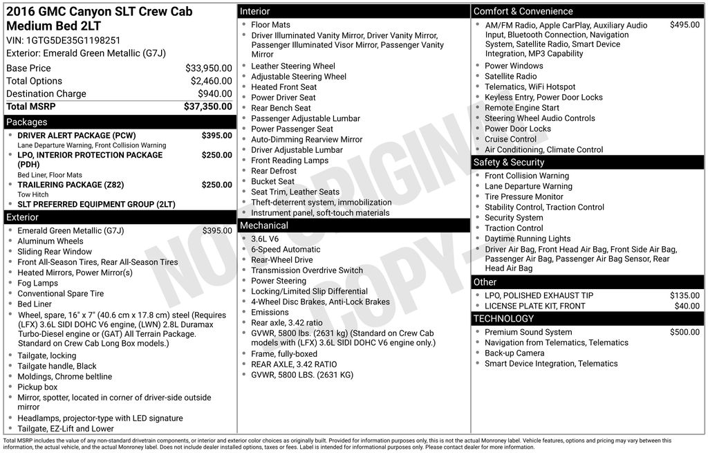 2016 GMC Canyon SLT Emerald Green Metallic SLT RWD 6-Speed Automatic 3.6L V6 DGI DOHC VVT 3.42 Rear Axle Ratio, 4-Wheel Disc Brakes, 6 Speakers, ABS brakes, Air Conditioning, All-Weather Floor Mats, Alloy wheels, AM/FM radio: SiriusXM, Apple CarPlay, Auto-dimming Rear-View mirror, Automatic temperature control, Bose Premium 7-Speaker Audio System Feature, Bumpers: body-color, Compass, Delay-off headlights, Driver Alert Package, Driver door bin, Driver vanity mirror, Dual front impact airbags, Dual front side impact airbags, Electronic Stability Control, Emergency communication system: OnStar Guidance, Exterior Parking Camera Rear, Forward Collision Alert, Front anti-roll bar, Front Bucket Seats, Front Center Armrest, Front fog lights, Front License Plate Kit, Front reading lights, Front wheel independent suspension, Fully automatic headlights, Heated door mirrors, Heated Driver & Front Passenger Seats, Heated front seats, Illuminated entry, Interior Protection Package (LPO), Lane Departure Warning System, Leather-Appointed Seat Trim, Low tire pressure warning, Occupant sensing airbag, Outside temperature display, Overhead airbag, Overhead console, Panic alarm, Passenger door bin, Passenger vanity mirror, Polished Exhaust Tip, Power door mirrors, Power driver seat, Power passenger seat, Power steering, Power windows, Preferred Equipment Group 2LT, Premium audio system: IntelliLink, Radio data system, Radio: AM/FM Stereo 8" Diagonal Color Touch Screen, Radio: AM/FM Stereo w/8" Color Touch Navigation, Rear reading lights, Rear seat center armrest, Rear step bumper, Rear window defroster, Remote keyless entry, Rubber Bed Mat, Security system, SiriusXM Satellite Radio, Speed control, Speed-sensing steering, Steering wheel mounted audio controls, Tachometer, Telescoping steering wheel, Tilt steering wheel, Traction control, Trip computer, Variably intermittent wipers, Wheels: 18" x 8.5" Polished Cast Aluminum.