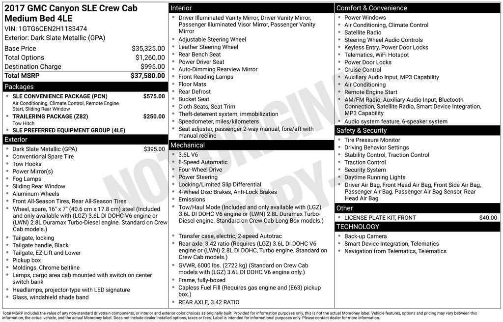 2017 GMC Canyon SLE1 Dark Slate Metallic SLE1 4WD 8-Speed Automatic V6 4WD, 3.42 Rear Axle Ratio, 4-Wheel Disc Brakes, 6 Speakers, ABS brakes, Air Conditioning, Alloy wheels, AM/FM radio: SiriusXM, Auto-dimming Rear-View mirror, Bumpers: body-color, Cloth Seat Trim, Compass, Delay-off headlights, Driver door bin, Driver vanity mirror, Dual front impact airbags, Dual front side impact airbags, Electronic Stability Control, Emergency communication system: OnStar Guidance, Exterior Parking Camera Rear, Front anti-roll bar, Front Bucket Seats, Front Center Armrest, Front fog lights, Front License Plate Kit, Front reading lights, Front Recovery Hooks, Front wheel independent suspension, Fully automatic headlights, Illuminated entry, Low tire pressure warning, Manual Rear-Sliding Window, Occupant sensing airbag, Outside temperature display, Overhead airbag, Overhead console, Panic alarm, Passenger door bin, Passenger vanity mirror, Power door mirrors, Power driver seat, Power steering, Power windows, Preferred Equipment Group 4LE, Premium audio system: IntelliLink, Radio data system, Radio: AM/FM Stereo 8" Diagonal Color Touch Screen, Rear reading lights, Rear seat center armrest, Rear step bumper, Rear window defroster, Remote keyless entry, Remote Vehicle Starter System, Security system, Single-Zone Auto Climate Control Air Conditioning, SiriusXM Satellite Radio, SLE Convenience Package, Speed control, Speed-sensing steering, Steering wheel mounted audio controls, Tachometer, Telescoping steering wheel, Tilt steering wheel, Traction control, Trailering Package, Trip computer, Variably intermittent wipers, Wheels: 17" x 8" Blade Silver Metallic, 4WD.