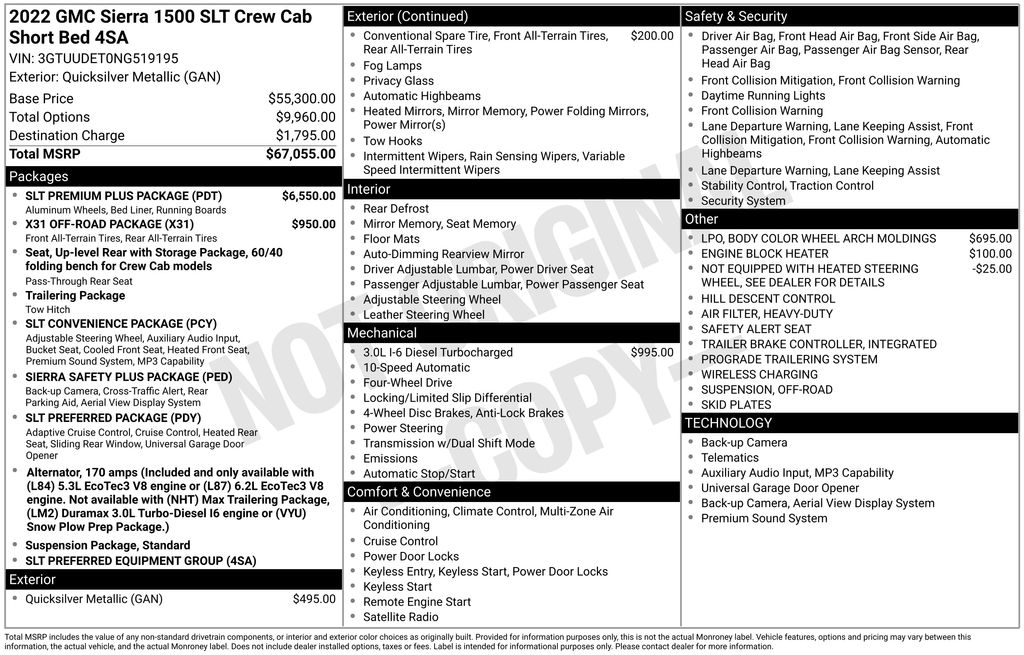 2022 GMC Sierra 1500 SLT Quicksilver Metallic SLT 4WD 10-Speed Automatic 3.0L I6 10-Speed Automatic, 4WD, Jet Black Leather, 10-Way Power Driver Seat Adjuster w/Lumbar, 10-Way Power Passenger Seat Adjuster w/Lumbar, 120-Volt Bed Mounted Power Outlet, 120-Volt Instrument Panel Power Outlet, 170 Amp Alternator, 2 Charge/Data USB Ports, 2 Charge/Data USB Ports Inside Center Console, 2 Type-C Charge-Only Rear USB Ports, 20" Polished Aluminum Wheels, 220 Amp Alternator, 3.23 Rear Axle Ratio, 4-Wheel Disc Brakes, 6 Speakers, 6-Speaker Audio System Feature, ABS brakes, Adaptive Cruise Control, Air Conditioning, Alloy wheels, AM/FM radio: SiriusXM with 360L, Apple CarPlay/Android Auto, Auto High-beam Headlights, Auto-dimming door mirrors, Auto-dimming Rear-View mirror, Auto-Locking Rear Differential, Automatic Emergency Braking, Automatic temperature control, Auxiliary External Transmission Oil Cooler, Body Color Wheel Arch Moldings (LPO), Brake assist, Buckle to Drive, Bumpers: chrome, Chrome Header & Chrome Grille Insert Bars, Chrome Wheel To Wheel Assist Steps, Color-Keyed Carpeting Floor Covering, Compass, Deep-Tinted Glass, Delay-off headlights, Driver door bin, Driver Memory, Driver vanity mirror, Dual Exhaust System, Dual front impact airbags, Dual front side impact airbags, Electric Rear-Window Defogger, Electrical Steering Column Lock, Electronic Precision Shift, Electronic Stability Control, Emergency communication system: OnStar and GMC Connected Services capable, Engine Block Heater, Exterior Parking Camera Rear, Floor-Mounted Center Console, Following Distance Indicator, Forward Collision Alert, Front 40/20/40 Split-Bench Seat, Front anti-roll bar, Front Bucket Seats, Front Center Armrest w/Storage, Front dual zone A/C, Front fog lights, Front Frame-Mounted Black Recovery Hooks, Front Pedestrian Braking, Front Rainsensing Wipers, Front reading lights, Front wheel independent suspension, Fully automatic headlights, GMC Connected Access Capable, HD Rear Vision Camera, HD Surround Vision, Heated 2nd Row Outboard Seats, Heated door mirrors, Heated Driver & Front Outboard Passenger Seating, Heated front seats, Heated Steering Wheel, Heated steering wheel, Heavy-Duty Air Filter, High Capacity Suspension Package, Hill Descent Control, Hitch Guidance, Hitch Guidance w/Hitch View, Illuminated entry, In-Vehicle Trailering App, Integrated Trailer Brake Controller, IntelliBeam Automatic High Beam On/Off, Keyless Open & Start, Lane Keep Assist w/Lane Departure Warning, LED Cargo Area Lighting, Low tire pressure warning, Manual Tilt-Wheel & Telescoping Steering Column, Memory seat, Navigation System, Not Equipped w/Heated Steering Wheel (DISC), Occupant sensing airbag, Off-Road Suspension, OnStar & GMC Connected Services Capable, Outside temperature display, Overhead airbag, Overhead console, Panic alarm, Passenger door bin, Passenger vanity mirror, Perf Leather-Appointed Front Outboard Seat Trim, Perimeter Lighting, Power Door Locks, Power door mirrors, Power driver seat, Power Front Passenger Windows w/Express Up/Down, Power Front Windows w/Driver Express Up/Down, Power passenger seat, Power Rake & Telescoping Steering Column, Power Rear Windows w/Express Down, Power Sliding Rear Window w/Rear Defogger, Power steering, Power windows, Preferred Equipment Group 4SA, Premium audio system: GMC Infotainment System, Premium Bose 7-Speaker Sound System, ProGrade Trailering System, Push Button Start, Radio data system, Radio: Premium GMC Infotainment Audio System, Rain sensing wipers, Rear Cross Traffic Braking, Rear Pedestrian Detection, Rear reading lights, Rear seat center armrest, Rear step bumper, Rear Wheelhouse Liners, Rear window defroster, Remote keyless entry, Remote Vehicle Starter System, Safety Alert Seat, Security system, Sierra Safety Plus Package, SiriusXM w/360L, SLT Convenience Package, SLT Preferred Package, SLT Premium Plus Package, Speed control, Speed-sensing steering, Split folding rear seat, Spray-On Pickup Bed Liner