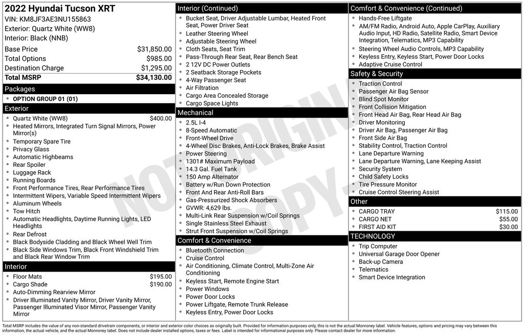 2022 Hyundai Tucson XRT Quartz White XRT FWD 8-Speed Automatic with SHIFTRONIC 2.5L I4 DGI DOHC 16V LEV3-ULEV70 187hp 3.648 Axle Ratio, 4-Wheel Disc Brakes, 6 Speakers, ABS brakes, Air Conditioning, Alloy wheels, AM/FM radio: SiriusXM, Apple CarPlay & Android Auto, Auto High-beam Headlights, Auto-dimming Rear-View mirror, Automatic temperature control, Brake assist, Bumpers: body-color, Cargo Cover, Cargo Net, Cargo Tray, Carpeted Floor Mats, Delay-off headlights, Driver door bin, Driver vanity mirror, Dual front impact airbags, Dual front side impact airbags, Electronic Stability Control, Emergency communication system: Blue Link Connected Car Service (3-year complimentary subscription), First Aid Kit, Four wheel independent suspension, Front anti-roll bar, Front Bucket Seats, Front Center Armrest, Front dual zone A/C, Front reading lights, Fully automatic headlights, Garage door transmitter: HomeLink, Heated door mirrors, Heated Front Bucket Seats, Heated front seats, Illuminated entry, Leather Shift Knob, Low tire pressure warning, Occupant sensing airbag, Option Group 01, Outside temperature display, Overhead airbag, Overhead console, Panic alarm, Passenger door bin, Passenger vanity mirror, Power door mirrors, Power driver seat, Power Liftgate, Power steering, Power windows, Radio data system, Radio: AM/FM/HD/SiriusXM Audio System, Rear anti-roll bar, Rear reading lights, Rear seat center armrest, Rear window defroster, Rear window wiper, Remote keyless entry, Roof rack, Security system, Speed control, Split folding rear seat, Spoiler, Stain & Odor Resistant Cloth Seat Trim, Steering wheel mounted audio controls, Tachometer, Telescoping steering wheel, Tilt steering wheel, Traction control, Trip computer, Turn signal indicator mirrors, Variably intermittent wipers, Wheels: 19" Black Alloy.
