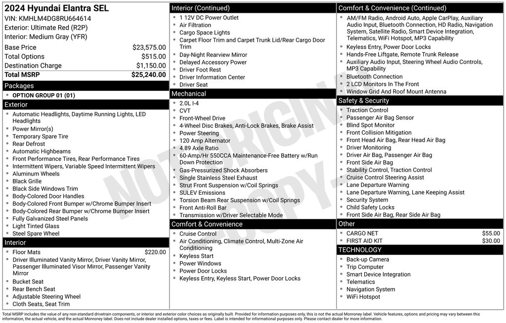 2024 Hyundai Elantra SEL Ultimate Red SEL FWD CVT I4 16" x 6.5J Alloy Wheels, 4-Wheel Disc Brakes, 6 Speakers, ABS brakes, Air Conditioning, All-Season Fitted Liners, Alloy wheels, AM/FM radio: SiriusXM, Apple CarPlay & Android Auto, Auto High-beam Headlights, Automatic temperature control, Brake assist, Bumpers: body-color, Cargo Net, Carpeted Floor Mats, Cloth Seat Trim, Delay-off headlights, Driver door bin, Driver vanity mirror, Dual front impact airbags, Dual front side impact airbags, Electronic Stability Control, Emergency communication system: Bluelink+, Exterior Parking Camera Rear, First Aid Kit, Front anti-roll bar, Front Bucket Seats, Front Center Armrest, Front dual zone A/C, Front reading lights, Front wheel independent suspension, Fully automatic headlights, Illuminated entry, Low tire pressure warning, Navigation System, Occupant sensing airbag, Option Group 01, Outside temperature display, Overhead airbag, Overhead console, Panic alarm, Passenger door bin, Passenger vanity mirror, Power door mirrors, Power steering, Power windows, Radio: AM/FM/HD/SiriusXM Display Audio, Rear side impact airbag, Rear window defroster, Remote keyless entry, Security system, Speed control, Speed-sensing steering, Steering wheel mounted audio controls, Tachometer, Telescoping steering wheel, Tilt steering wheel, Traction control, Trip computer, Variably intermittent wipers.