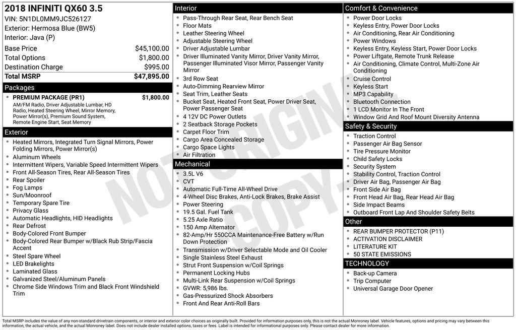 2018 INFINITI QX60 Base Hermosa Blue AWD CVT 3.5L V6 2-Way Driver's Seat Power Lumbar Support, 3rd row seats: bench, 4-Wheel Disc Brakes, 5.25 Axle Ratio, 6 Speakers, ABS brakes, Air Conditioning, Alloy wheels, AM/FM radio: SiriusXM, AM/FM/CD/MP3 Audio System, Auto-dimming Rear-View mirror, Automatic temperature control, Bodyside moldings, Brake assist, Bumpers: body-color, CD player, Delay-off headlights, Driver door bin, Driver vanity mirror, Dual front impact airbags, Dual front side impact airbags, Dual Occupant Memory System, Electronic Stability Control, Enhanced Intelligent Key Memory, Entry & Exit Assist, Four wheel independent suspension, Front anti-roll bar, Front Bucket Seats, Front Center Armrest w/Storage, Front dual zone A/C, Front fog lights, Front reading lights, Fully automatic headlights, Garage door transmitter, Heated door mirrors, Heated Front Seats, Heated front seats, Heated Steering Wheel, High intensity discharge headlights: Bi-Xenon, Illuminated entry, Leather Shift Knob, Leather steering wheel, Leather-Appointed Seats, Low tire pressure warning, Occupant sensing airbag, Outside Mirrors w/Reverse Tilt-Down Feature, Outside temperature display, Overhead airbag, Overhead console, Panic alarm, Passenger door bin, Passenger vanity mirror, Power door mirrors, Power driver seat, Power Liftgate, Power moonroof, Power passenger seat, Power steering, Power windows, Premium Package, Radio data system, Radio: AM/FM/CD/DVD w/MP3 Playback Capability, Rear air conditioning, Rear anti-roll bar, Rear Bumper Protector, Rear reading lights, Rear seat center armrest, Rear window defroster, Rear window wiper, Reclining 3rd row seat, Remote Engine Start, Remote keyless entry, Roof Rails, Security system, Speed control, Speed-sensing steering, Speed-Sensitive Wipers, Split folding rear seat, Spoiler, Steering wheel mounted audio controls, Tachometer, Telescoping steering wheel, Tilt steering wheel, Traction control, Trip computer, Turn signal indicator mirrors, Variably intermittent wipers, Wheels: 18" Triple 5-Spoke Aluminum-Alloy.