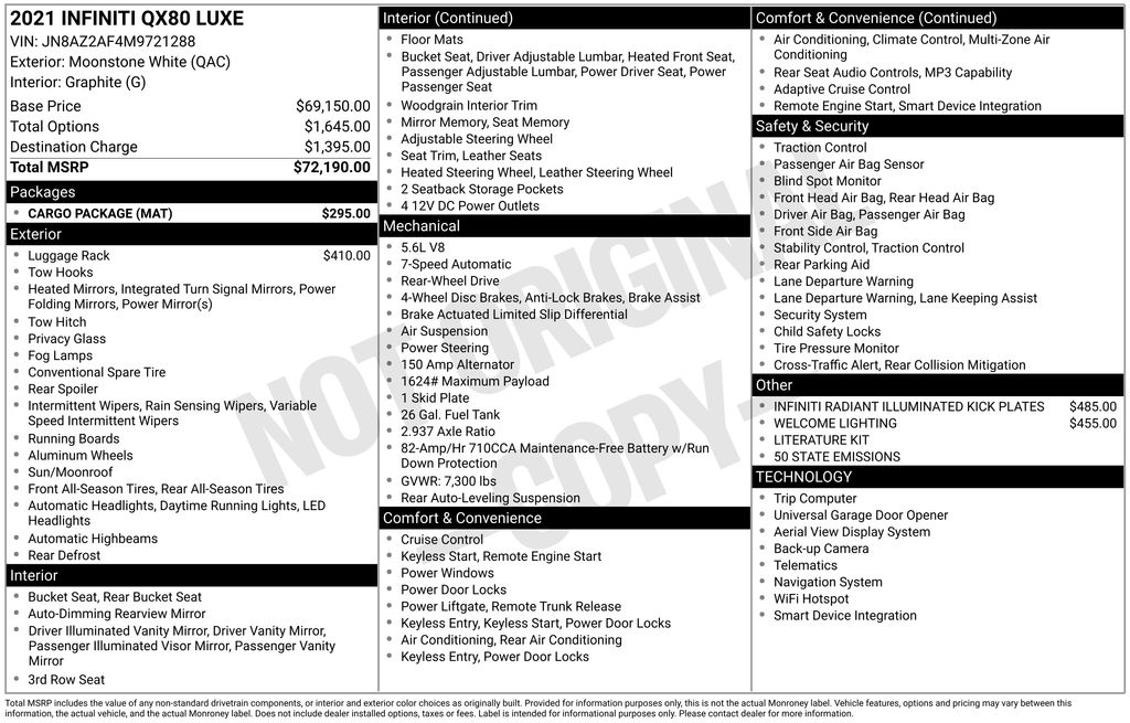 2021 INFINITI QX80 LUXE Moonstone White LUXE RWD 7-Speed Automatic 5.6L V8 13 Speakers, 2.937 Axle Ratio, 3rd row seats: split-bench, 4-Wheel Disc Brakes, ABS brakes, Air Conditioning, Alloy wheels, AM/FM radio: SiriusXM, Anti-whiplash front head restraints, Apple CarPlay/Android Auto, Auto High-beam Headlights, Auto tilt-away steering wheel, Auto-dimming door mirrors, Auto-dimming Rear-View mirror, Auto-leveling suspension, Automatic temperature control, Brake assist, Bumpers: body-color, Cargo Package, CD player, Compass, Delay-off headlights, Driver door bin, Driver vanity mirror, Dual front impact airbags, Dual front side impact airbags, DVD-Audio, Electronic Stability Control, Emergency communication system: INFINITI Connection, First-Aid Kit, Four wheel independent suspension, Front anti-roll bar, Front Bucket Seats, Front Center Armrest, Front dual zone A/C, Front fog lights, Front reading lights, Fully automatic headlights, Garage door transmitter: HomeLink, Heated door mirrors, Heated Front Bucket Seats, Heated front seats, Heated steering wheel, High-Density Non-Slip Rear Cargo Carpet, Illuminated entry, INFINITI Radiant Illuminated Kick Plates, Leather Shift Knob, Leather steering wheel, Leather-Appointed Seats, Literature Kit, Low tire pressure warning, Memory seat, Navigation system: INFINITI InTouch Navigation, Nylon-Cord Cargo Net, Occupant sensing airbag, Outside temperature display, Overhead airbag, Overhead console, Panic alarm, Passenger door bin, Passenger vanity mirror, Power door mirrors, Power driver seat, Power Liftgate, Power moonroof, Power passenger seat, Power steering, Power windows, Radio data system, Radio: Bose Audio System w/13 Speakers, Rain sensing wipers, Rear air conditioning, Rear anti-roll bar, Rear audio controls, Rear reading lights, Rear seat center armrest, Rear window defroster, Rear window wiper, Reclining 3rd row seat, Remote keyless entry, Roof Rail Cross Bars, Security system, Speed control, Speed-sensing steering, Split folding rear seat, Spoiler, Steering wheel memory, Steering wheel mounted audio controls, Tachometer, Telescoping steering wheel, Tilt steering wheel, Traction control, Trip computer, Turn signal indicator mirrors, Variably intermittent wipers, Voltmeter, Welcome Lighting, Wheels: 20" x 8.0" Aluminum-Alloy.
