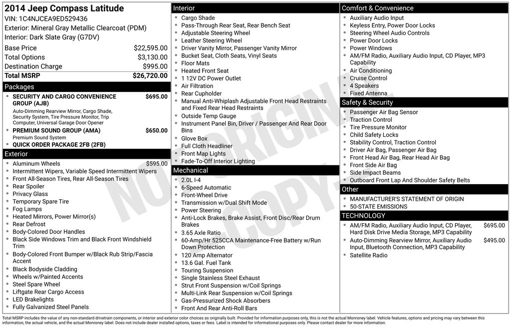 2014 Jeep Compass Latitude Mineral Gray Metallic Clearcoat Latitude FWD 6-Speed Automatic 2.0L I4 DOHC 16V Dual VVT 1-Year SiriusXM Radio Service, 16" x 6.5" Aluminum Wheels, 17" x 6.5" Aluminum Wheels, 2 Articulating Liftgate Speakers, 3.65 Axle Ratio, 4 Speakers, 40GB Hard Drive w/28GB Available, 6.5" Touchscreen Display, 9 Boston Acoustic Speakers w/Subwoofer, ABS brakes, Air Conditioning, Alloy wheels, AM/FM radio, Anti-whiplash front head restraints, Audio Jack Input for Mobile Devices, Auto-Dimming Rear-View Mirror, Brake assist, Bumpers: body-color, CD player, Cloth/Vinyl Low-Back Bucket Seats, Driver door bin, Driver vanity mirror, Dual front impact airbags, Dual front side impact airbags, Electronic Stability Control, Four wheel independent suspension, Front anti-roll bar, Front Bucket Seats, Front Center Armrest w/Storage, Front fog lights, Front reading lights, Heated door mirrors, Heated front seats, Illuminated entry, Low tire pressure warning, Occupant sensing airbag, Outside temperature display, Overhead airbag, Panic alarm, Passenger door bin, Passenger vanity mirror, Power door mirrors, Power steering, Power windows, Premium Sound Group, Quick Order Package 2FB (DISC), Radio: Uconnect 130 AM/FM/CD/MP3, Radio: Uconnect 430 CD/DVD/MP3/HDD, Rear anti-roll bar, Rear window defroster, Rear window wiper, Rear-View Auto-Dimming Mirror w/Microphone, Remote keyless entry, Remote USB Port, Roof rack: rails only, Security Alarm, Security and Cargo Convenience Group, SIRIUS Satellite Radio, Soft Tonneau Cover, Speed control, Split folding rear seat, Spoiler, Steering wheel mounted audio controls, Tachometer, Tilt steering wheel, Tire Pressure Monitoring Display, Traction control, Uconnect Voice Command w/Bluetooth, Universal Garage Door Opener, Variably intermittent wipers, Vehicle Information Center.