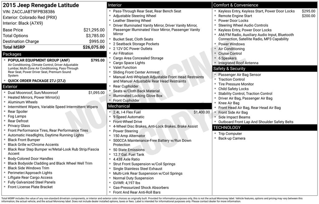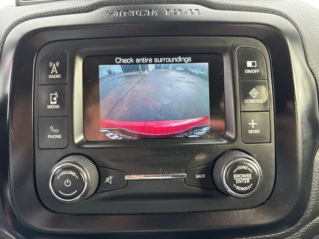 2015 Jeep Renegade Latitude Colorado Red Latitude FWD 9-Speed 948TE Automatic 2.4L I4 MultiAir 115V Auxiliary Power Outlet, 16" x 6.5" Aluminum Wheels, 4-Wheel Disc Brakes, 40/20/40 Rear Seat w/Trunk Pass-Thru, 6 Speakers, 9 Amplified Speakers w/Subwoofer, ABS brakes, Air Conditioning, Air Conditioning ATC w/Dual Zone Control, Alloy wheels, AM/FM radio: SiriusXM, Anti-whiplash front head restraints, Brake assist, Cloth Low-Back Bucket Seats, Compass, Delay-off headlights, Driver door bin, Driver vanity mirror, Dual front impact airbags, Dual front side impact airbags, Electronic Stability Control, Four wheel independent suspension, Front anti-roll bar, Front Bucket Seats, Front Center Armrest, Front fog lights, Front reading lights, Fully automatic headlights, Heated door mirrors, Illuminated entry, Knee airbag, Leather steering wheel, Low tire pressure warning, Normal Duty Suspension, Occupant sensing airbag, Outside temperature display, Overhead airbag, Overhead console, Panic alarm, ParkView Rear Back-Up Camera, Passenger door bin, Passenger vanity mirror, Passive Entry/Keyless Go, Popular Equipment Group, Power 4-Way Driver Lumbar Adjust, Power 8-Way Driver Manual 4-Way Passenger Seats, Power door mirrors, Power steering, Power windows, Quick Order Package 27J, Radio data system, Radio: Uconnect 5.0 AM/FM/BT, Rear anti-roll bar, Rear reading lights, Rear window defroster, Rear window wiper, Remote keyless entry, Remote Start System, Roof rack: rails only, Speed control, Split folding rear seat, Spoiler, Steering wheel mounted audio controls, Tachometer, Telescoping steering wheel, Tilt steering wheel, Traction control, Trip computer, Variably intermittent wipers, Voltmeter.