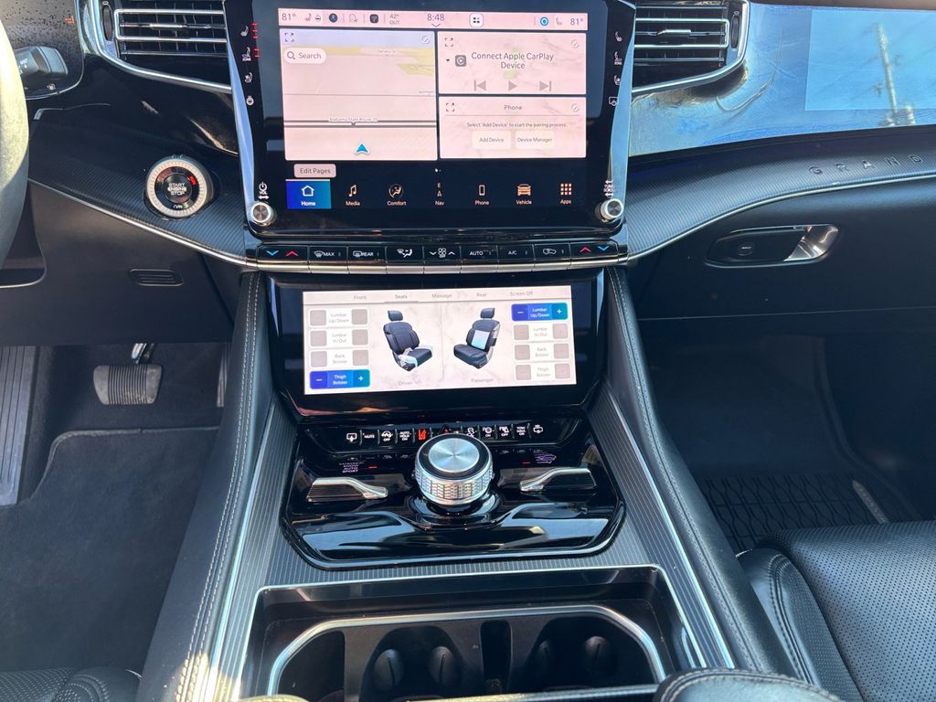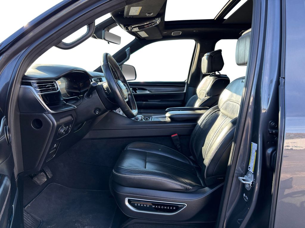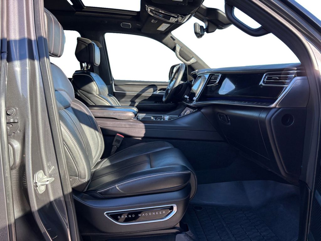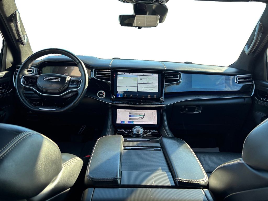 2024 Jeep Grand Wagoneer L Series II Baltic Gray Metallic Clearcoat Series II 4WD 8-Speed Automatic 3.0L I6 19 Speakers, 23 Speaker McIntosh Reference Audio System, 3.92 Rear Axle Ratio, 3rd row seats: bench, 4-Wheel Disc Brakes, ABS brakes, Adjustable pedals, Adjustable Roof Rail Crossbars, Air Conditioning, Alloy wheels, AM/FM radio: SiriusXM with 360L, Anti-whiplash front head restraints, Apple CarPlay/Android Auto, Audio memory, Auto High-beam Headlights, Auto-dimming door mirrors, Auto-dimming Rear-View mirror, Auto-leveling suspension, Automatic temperature control, Black Interior Accents, Black Roof, Brake assist, Bumpers: body-color, Compass, Delay-off headlights, Driver door bin, Driver vanity mirror, Driver's Seat Mounted Armrest, Dual front impact airbags, Dual front side impact airbags, Electronic Stability Control, Emergency communication system, Four wheel independent suspension, Front anti-roll bar, Front Bucket Seats, Front Center Armrest w/Storage, Front Console Cooler, Front dual zone A/C, Front fog lights, Front Passenger Interactive Display, Front reading lights, Fully automatic headlights, Garage door transmitter, Genuine wood console insert, Genuine wood dashboard insert, Genuine wood door panel insert, Gloss Black Upper & Lower DLO Molding, Heads-Up Display, Heated door mirrors, Heated front seats, Heated rear seats, Heated steering wheel, Illuminated entry, Knee airbag, Leather steering wheel, Leather Trimmed Bucket Seats, Low tire pressure warning, Memory seat, Navigation System, Normal Duty Suspension, Obsidian Appearance Package, Occupant sensing airbag, Outside temperature display, Overhead airbag, Overhead console, Panic alarm, Passenger door bin, Passenger seat mounted armrest, Passenger vanity mirror, Pedal memory, Piano Black Exterior Accents, Power adjustable front head restraints, Power door mirrors, Power driver seat, Power Liftgate, Power moonroof, Power passenger seat, Power steering, Power windows, Quick Order Package 28T Obsidian, Radio data system, Radio: Uconnect 5 Nav w/12.0" Display, Rain sensing wipers, Rear air conditioning, Rear anti-roll bar, Rear dual zone A/C, Rear reading lights, Rear seat center armrest, Rear window defroster, Rear window wiper, Rearview Autodim Digital Display Mirror, Reclining 3rd row seat, Remote keyless entry, Security system, Speed control, Speed-sensing steering, Speed-Sensitive Wipers, Split folding rear seat, Steering wheel memory, Steering wheel mounted audio controls, Tachometer, Telescoping steering wheel, Tilt steering wheel, Traction control, Trip computer, Turn signal indicator mirrors, Two Tone Paint Group, Variably intermittent wipers, Ventilated front seats, Ventilated Rear Seats, Voltmeter, Wheels: 22" x 9.0" Tinted Polished w/Black Insert.