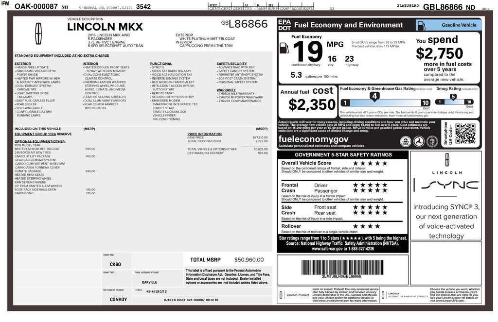 2016 Lincoln MKX Reserve White Platinum Clearcoat Metallic Reserve AWD 6-Speed Automatic with Select-Shift 3.7L V6 Ti-VCT AWD, 10 Speakers, 3.65 Axle Ratio, 4-Wheel Disc Brakes, 8" LCD Touch Screen, ABS brakes, Adaptive suspension, Air Conditioning, Alloy wheels, AM/FM radio: SiriusXM, AM/FM Stereo w/Single CD, Auto High-Beam Headlamps, Auto-dimming door mirrors, Auto-dimming Rear-View mirror, Automatic Rain-Sensing Wipers, Automatic temperature control, Blind spot sensor: BLIS warning, Brake assist, Bumpers: body-color, Cargo Utility Package, CD player, Climate Package, Compass, Compass Display, Delay-off headlights, Driver door bin, Driver vanity mirror, Dual front impact airbags, Dual front side impact airbags, Electronic Stability Control, Emergency communication system: SYNC 3 911 Assist, Equipment Group 102A, Exterior Parking Camera Rear, Four wheel independent suspension, Front anti-roll bar, Front Bucket Seats, Front Center Armrest, Front dual zone A/C, Front fog lights, Front reading lights, Fully automatic headlights, Garage door transmitter: HomeLink, Heated door mirrors, Heated front seats, Heated Rear Seats, Heated Steering Wheel, High-Intensity Discharge Headlights, Illuminated entry, Interior Cargo Cover, Knee airbag, Low tire pressure warning, Memory seat, Molded Plastic Storage Bins, Navigation System, Occupant sensing airbag, Outside temperature display, Overhead airbag, Overhead console, Panic alarm, Passenger door bin, Passenger vanity mirror, Power door mirrors, Power driver seat, Power Liftgate, Power moonroof, Power passenger seat, Power steering, Power windows, Prem Lthr-Trimmed Heated/Cooled Bucket Seats (BE), Radio data system, Rear anti-roll bar, Rear Cargo Management System, Rear Parking Sensors, Rear reading lights, Rear seat center armrest, Rear window defroster, Rear window wiper, Remote keyless entry, Satin Roof Rack Side Rails Without Crossbars, Security system, Speed control, Speed-Sensitive Wipers, Split folding rear seat, Spoiler, Steering wheel memory, Steering wheel mounted A/C controls, Steering wheel mounted audio controls, SYNC 3, Tachometer, Telescoping steering wheel, Tilt steering wheel, Traction control, Trip computer, Turn signal indicator mirrors, Variably intermittent wipers, Ventilated front seats, Wheels: 20" Premium Painted Aluminum w/20 Spokes, AWD.
