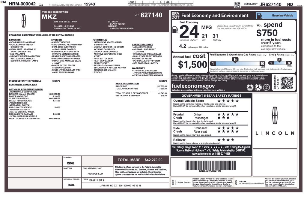 2018 Lincoln MKZ Select Black Velvet Metallic Select FWD 6-Speed Automatic with Select-Shift 2.0L I4 11 Speakers, 4-Wheel Disc Brakes, ABS brakes, Adaptive suspension, Air Conditioning, Alloy wheels, Aluminum Foot Pedal Cover, AM/FM radio: SiriusXM, AppLink/Apple CarPlay and Android Auto, Auto tilt-away steering wheel, Auto-dimming door mirrors, Auto-dimming Rear-View mirror, Automatic temperature control, BLIS Blind Spot Information System, Brake assist, Bumpers: body-color, CD player, Climate Package, Compass, Delay-off headlights, Driver door bin, Driver vanity mirror, Dual front impact airbags, Dual front side impact airbags, Electronic Stability Control, Emergency communication system: SYNC 3 911 Assist, Equipment Group 200A, Exterior Parking Camera Rear, Four wheel independent suspension, Front anti-roll bar, Front Bucket Seats, Front Center Armrest, Front dual zone A/C, Front License Plate Bracket, Front reading lights, Fully automatic headlights, Garage door transmitter, Genuine wood dashboard insert, Genuine wood door panel insert, Heated door mirrors, Heated front seats, Heated Rear-Seats, Heated Steering Wheel, High-Intensity Discharge Headlights, Illuminated entry, Knee airbag, Leather steering wheel, Low tire pressure warning, Magnetic Appearance Package, Memory seat, Navigation System, Occupant sensing airbag, Outside temperature display, Overhead airbag, Overhead console, Painted Upper Grille, Panic alarm, Passenger door bin, Passenger vanity mirror, Power door mirrors, Power driver seat, Power Moonroof, Power passenger seat, Power steering, Power Trunk Lid w/Soft Close, Power windows, Premium Leather-Trimmed Non-Perf Heated Buckets, Radio data system, Radio: Lincoln Premium Sound System w/Single CD, Rain Sensing Wipers, Rear anti-roll bar, Rear Parking Sensors, Rear reading lights, Rear seat center armrest, Rear window defroster, Remote keyless entry, Security system, Select Plus Package, Speed control, Speed-sensing steering, Speed-Sensitive Wipers, Split folding rear seat, Steering wheel memory, Steering wheel mounted audio controls, SYNC 3, Tachometer, Telescoping steering wheel, Tilt steering wheel, Traction control, Trip computer, Turn signal indicator mirrors, Variably intermittent wipers, Wheels: 18" Machined 5 Spoke Aluminum, Wheels: 19" Satin Finish 10 Spk Machined-Aluminum, Windshield Wiper De-Icer.