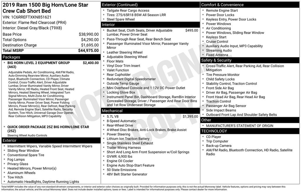 2019 Ram 1500 Big Horn/Lone Star RWD 8-Speed Automatic HEMI 5.7L V8 Multi Displacement VVT Flame Red Clearcoat