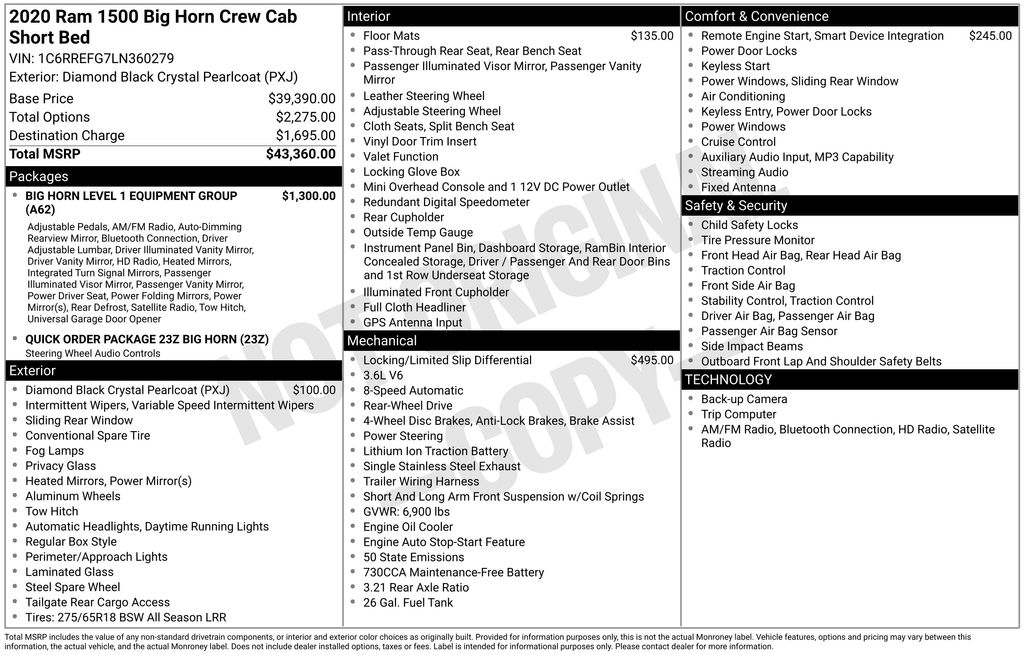 2020 Ram 1500 Big Horn/Lone Star RWD 8-Speed Automatic 3.6L V6 24V VVT Diamond Black Crystal Pearlcoat