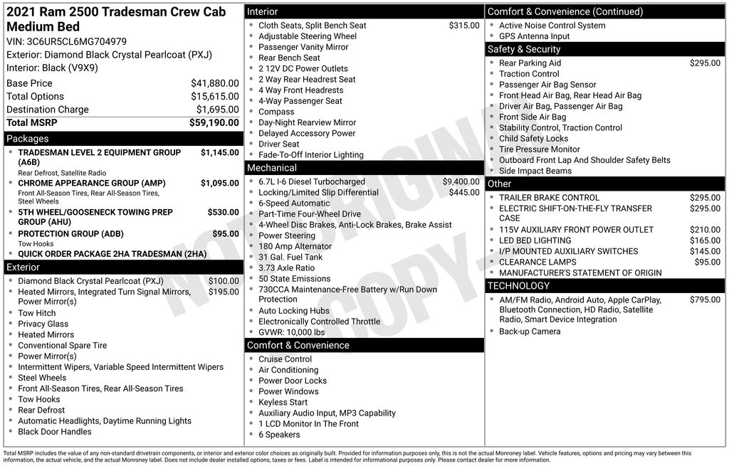 2021 Ram 2500 Tradesman **Here at Long-Lewis we believe in being transparent. We have no Doc fees, or any other hidden fees. We are a one price store and give our best price up front and they are clearly marked on all our inventory.** Diamond Black Crystal Pearlcoat 4WD 6-Speed Automatic Cummins 6.7L I6 Turbodiesel
