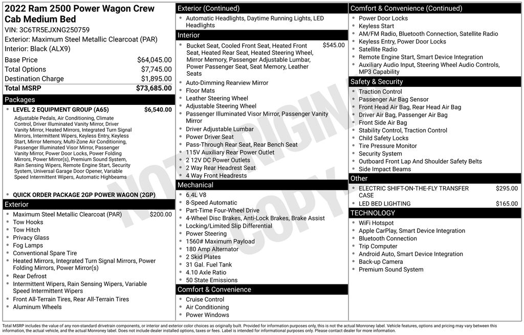 Recent Arrival! #1 Seat Foam Cushion, 115V Auxiliary Rear Power Outlet, 2 Way Rear Headrest Seat, 2-Door Passive Entry, Front Door Locks, 2nd Row In Floor Storage Bins, 4 Way Front Headrests, 4-Wheel Disc Brakes, 4.10 Axle Ratio, 40/20/40 Split Bench Seat, 4G LTE Wi-Fi Hot Spot, 6 Speakers, 8.4" Touchscreen Display, 9 Alpine Speakers w/Subwoofer, ABS brakes, Air Conditioning, Air Conditioning ATC w/Dual Zone Control, Alloy wheels, AM/FM radio: SiriusXM, Apple CarPlay, Apple CarPlay/Android Auto, Auto High Beam Headlamp Control, Auto-dimming Rear-View mirror, Black Exterior Mirrors, Block heater, Bluetooth Handsfree Phone & Audio, Body Color Door Handles, Brake assist, Cloth Power Bench Seat w/Emboss Tread Pattern, Compass, Connectivity - US/Canada, Delay-off headlights, Driver door bin, Dual front impact airbags, Dual front side impact airbags, Electric Shift-On-The-Fly Transfer Case, Electronic Stability Control, Exterior Mirrors Courtesy Lamps, Exterior Mirrors w/Heating Element, Exterior Mirrors w/Memory, Exterior Mirrors w/Supplemental Signals, Foam Bottle Insert (Door Trim Panel), Folding Flat Load Floor Storage, Front & Rear Floor Mats, Front anti-roll bar, Front Armrest w/Cupholders, Front Center Armrest w/Storage, Front Center Seat Cushion Storage, Front Door Accent Lighting, Front fog lights, Front reading lights, Front Seat Back Map Pockets, Fully automatic headlights, Global Telematics Box Module (TBM), Google Android Auto, GPS Antenna Input, Heated door mirrors, Heated Front Seats, Heated Second Row Seats, Heated Steering Wheel, High Back Seats, Illuminated entry, Integrated Center Stack Radio, Integrated Voice Command w/Bluetooth, Leather steering wheel, Leather Trim 40/20/40 Bench Seat, LED Bed Lighting, LED Dome Lamp w/On/Off Switch, LED Interior Lighting, Level 2 Equipment Group, Low tire pressure warning, Media Hub w/2 Charge Only USBs, Mirror Running Lights, Mirror-Mounted Aux Reverse Lamps, Occupant sensing airbag, Outside temperature display, Overhead airbag, Overhead console, Overhead LED Lamps, Panic alarm, ParkView Rear Back-Up Camera, Passenger door bin, Passenger vanity mirror, Power 2-Way Driver Lumbar Adjust, Power 2-Way Passenger Lumbar Adjust, Power Adjust 8-Way Driver Seat, Power Adjust 8-Way Front Passenger Seat, Power Adjustable Convex Aux Mirrors, Power Adjustable Pedals w/Memory, Power Black Tow Mirrors w/Convex Spotter & Memory, Power door mirrors, Power driver seat, Power Folding Mirrors, Power steering, Power windows, Premium Overhead Console, Quick Order Package 2GP Power Wagon, Radio data system, Radio: Uconnect 5 W w/8.4" Display, Radio/Driver Seat/Mirrors/Pedals Memory, Rain sensing wipers, Rain Sensitive Windshield Wipers, Rear 60/40 Folding Seat, Rear anti-roll bar, Rear Door Accent Lighting, Rear seat center armrest, Rear step bumper, Rear window defroster, Remote keyless entry, Remote Start System, Remote Tailgate Release, Security Alarm, Selectable Tire Fill Alert, SiriusXM Radio Service, SiriusXM Satellite Radio, Speed control, Split folding rear seat, Steering wheel mounted audio controls, Storage Tray, Sun Visors w/Illuminated Vanity Mirrors, Tachometer, Tilt steering wheel, Traction control, Trailer Tow Mirrors, Trip computer, Turn signal indicator mirrors, Universal Garage Door Opener, Variably intermittent wipers, Vendor Painted Cargo Box, Vendor Painted Cargo Box Tracking, Ventilated Front Seats, Voltmeter, Wheels: 17" x 8.0" Matte Black/Diamond Cut.